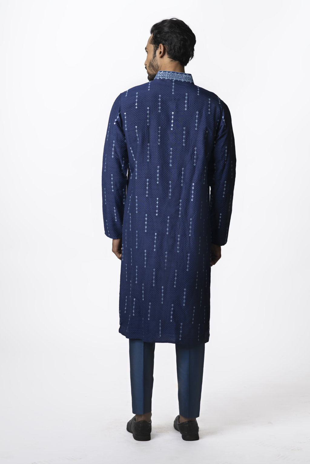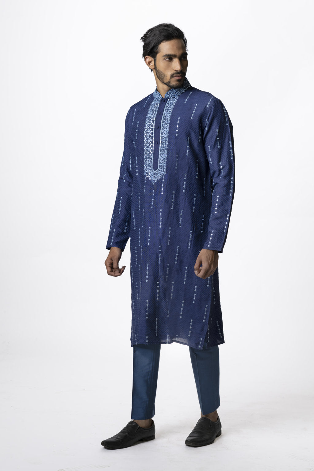Featuring a Ocean kurta in tussar base with block print and mirrior hand embroidery. It is paired with contrasting churidar pants.