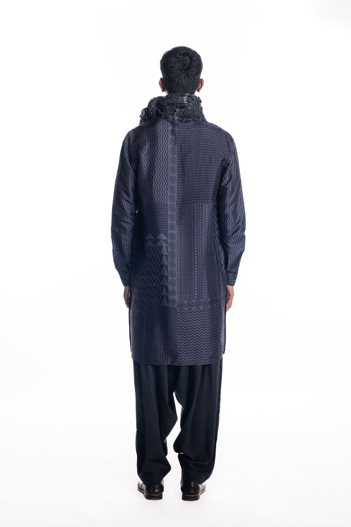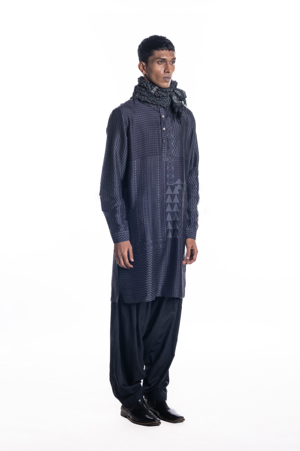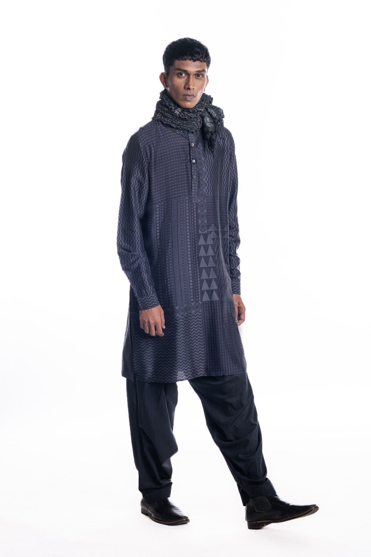 Engineered multi block-printed navy kurta with Band collar and cuffs, paired with comfortable salwar pants