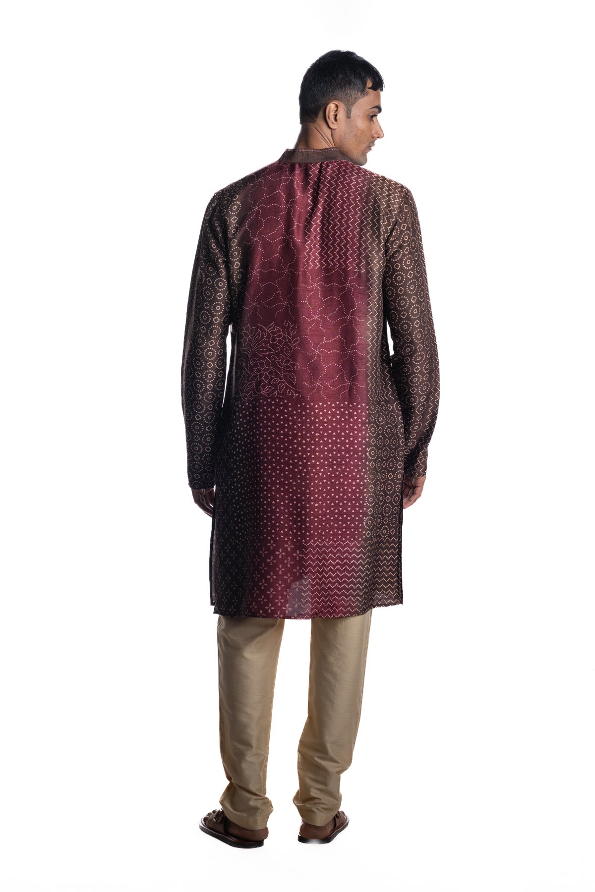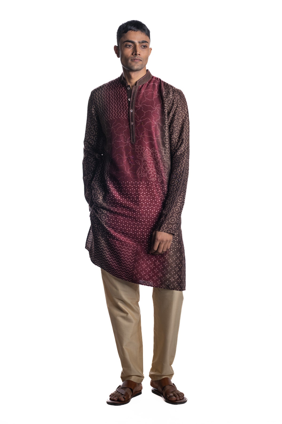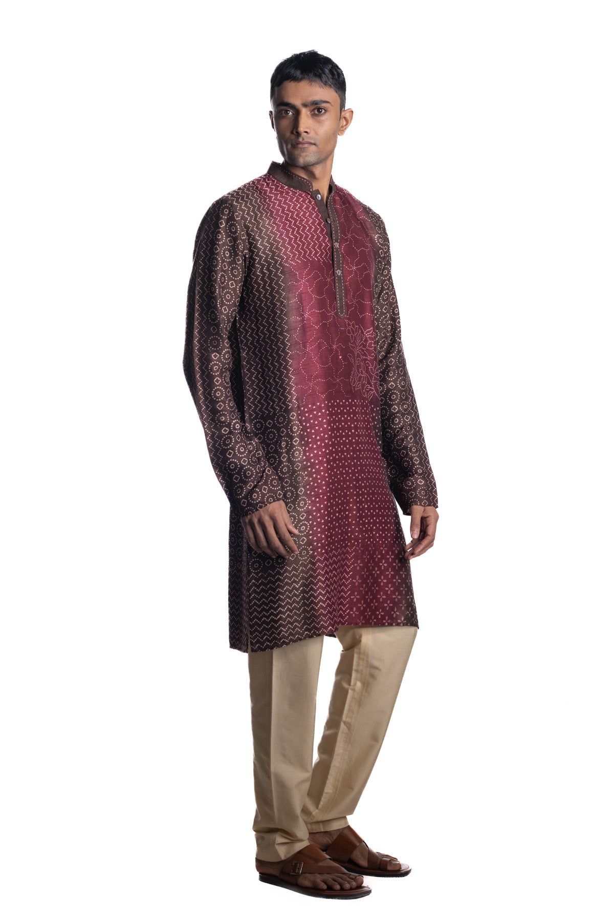 Ombré maroon and brown kurta with engineered placement of hand block–printed motifs, finished with a contrast band collar and placket.