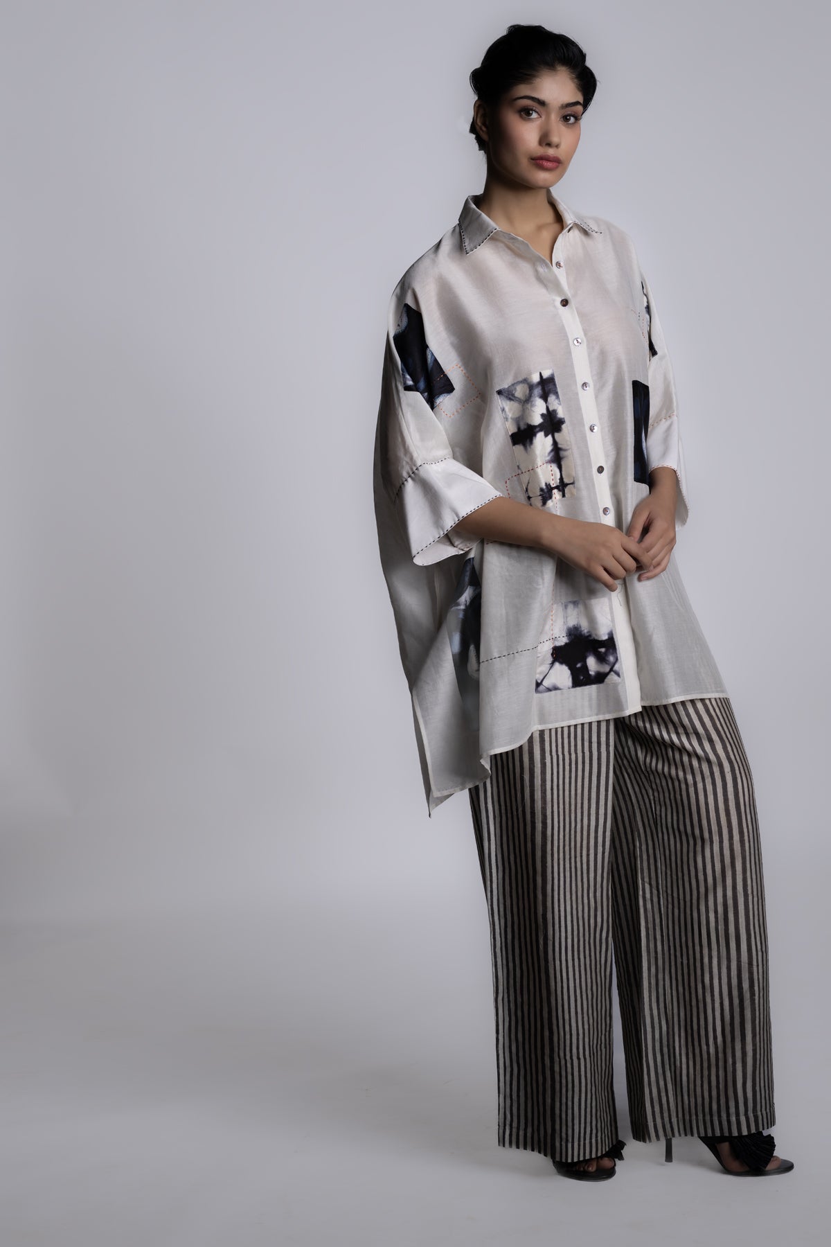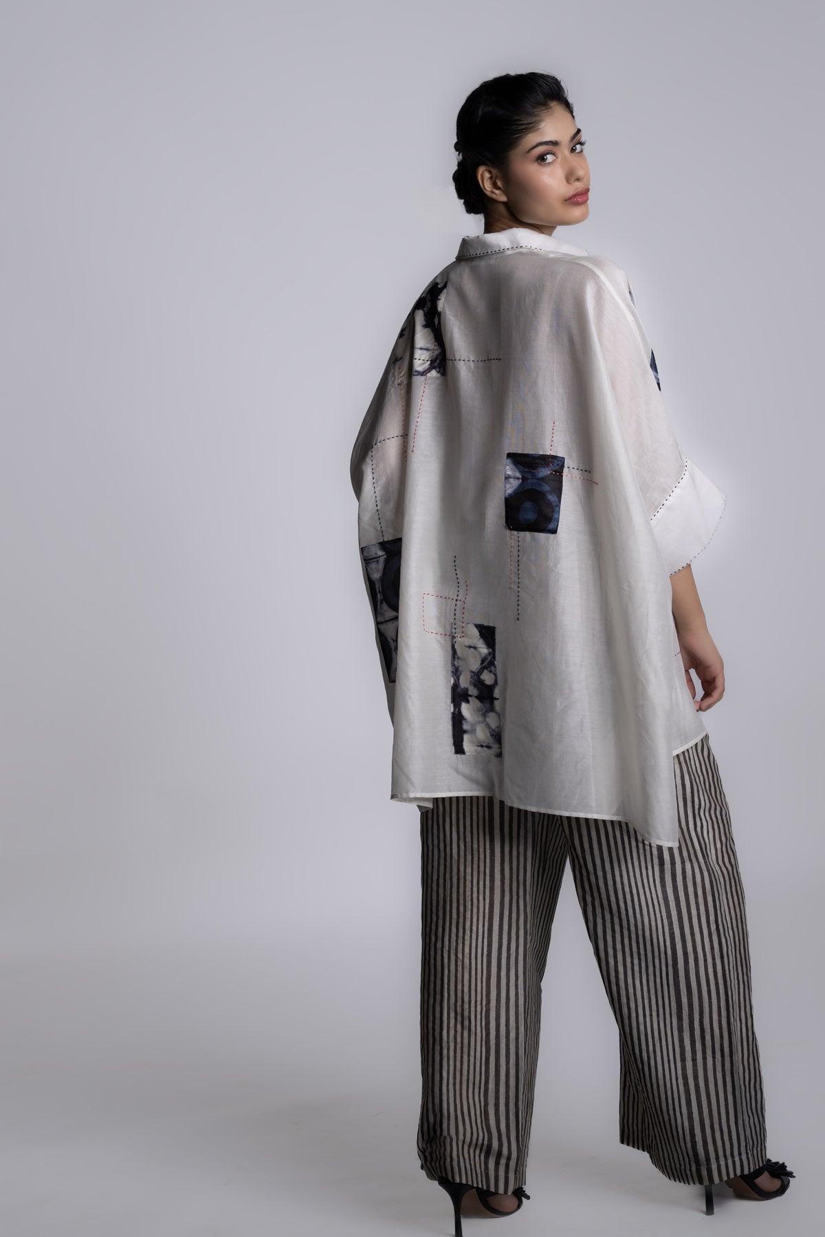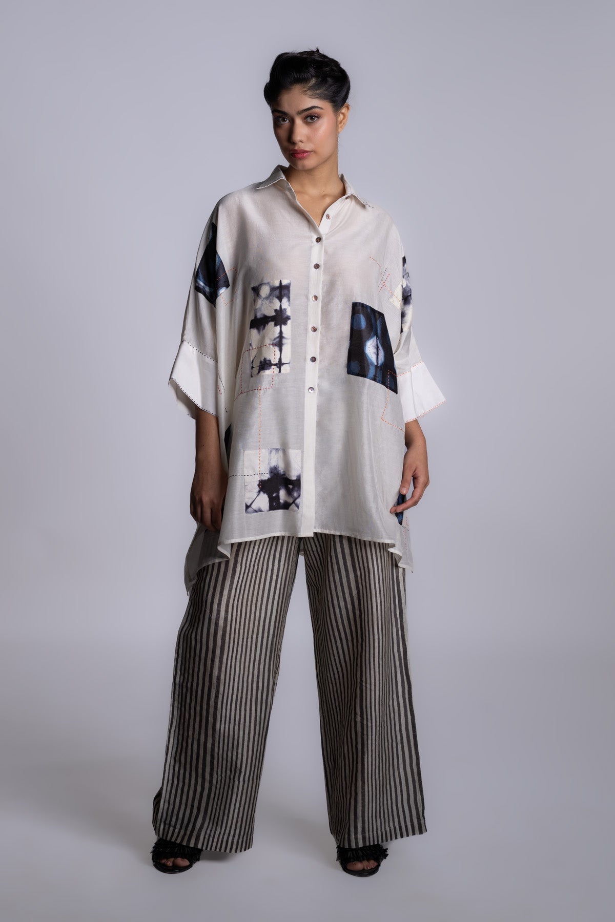 One-size short kaftan shirt with cuffs and a relaxed silhouette. Detailed with patchwork shibori and hand-applied textures. Paired with comfort-fit hand block printed, tinted striped pants