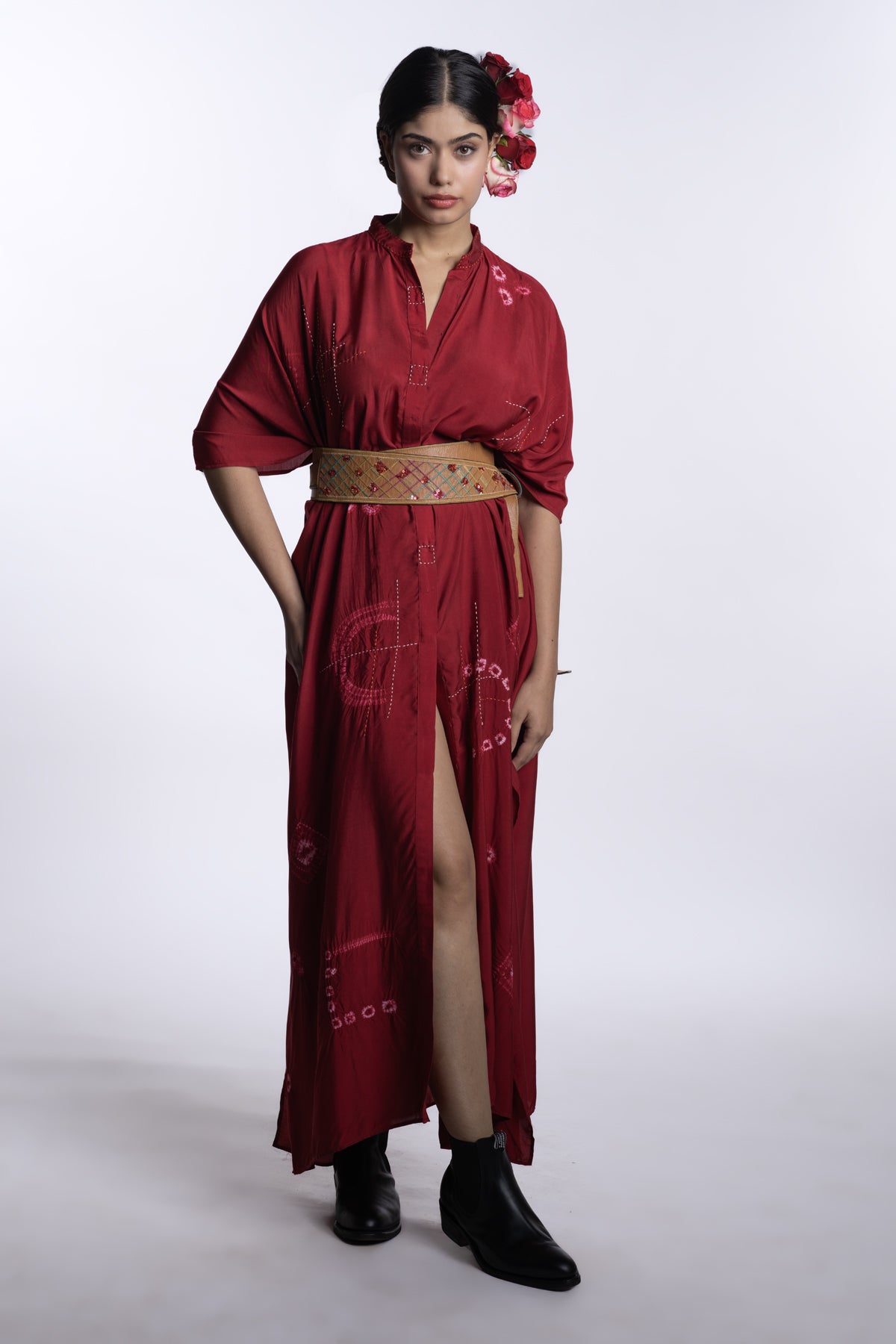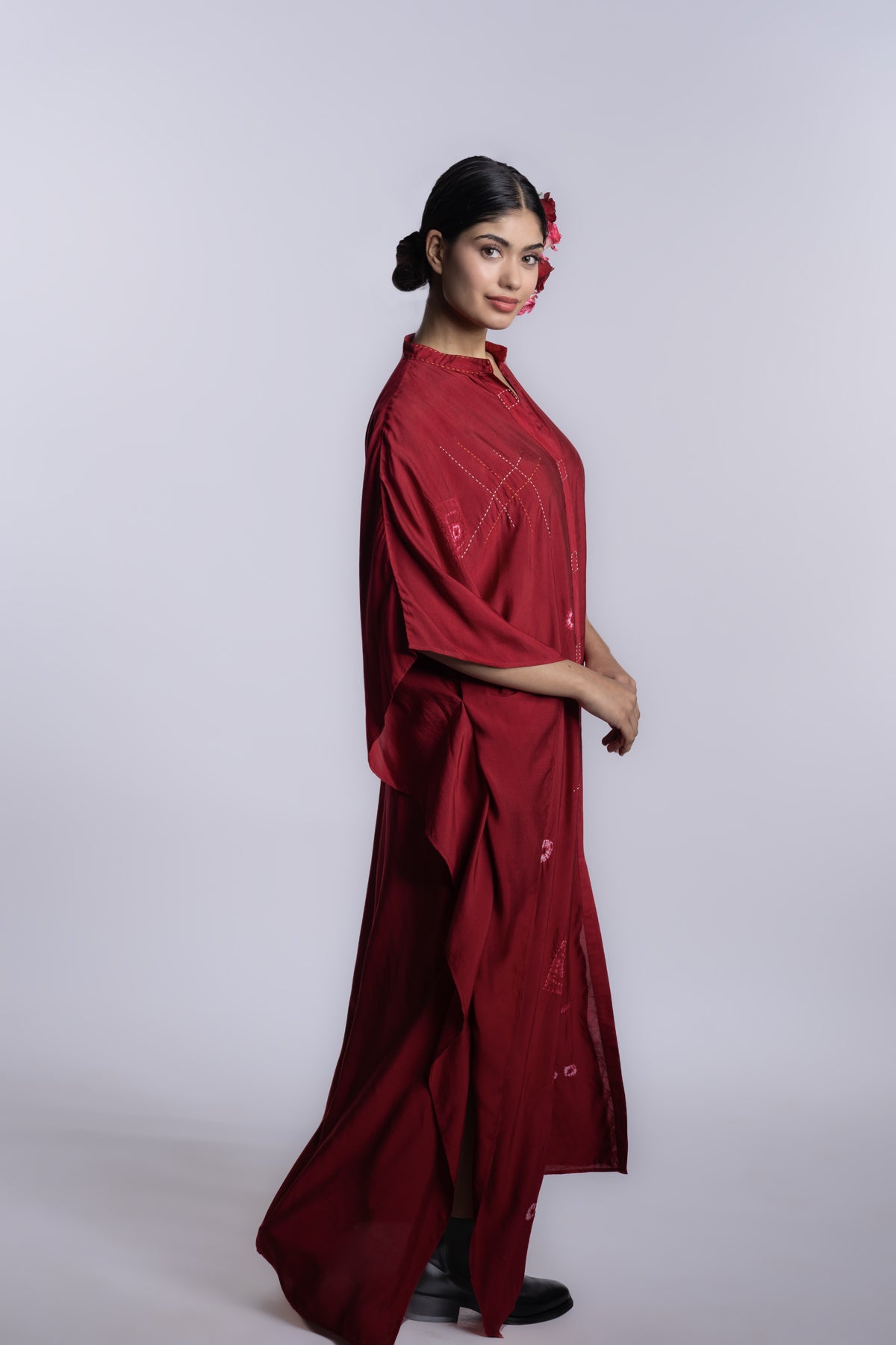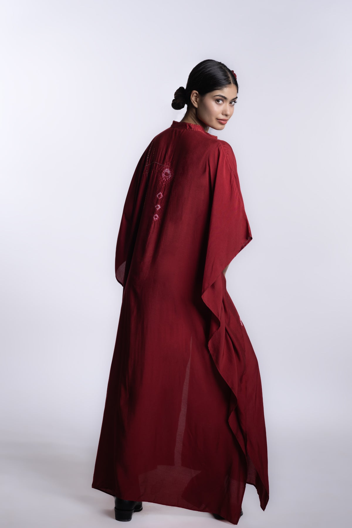 Red one-size front open kaftan dress with a fluid, relaxed silhouette. Accented with scattered shibori motifs and subtle handcrafted surface details.