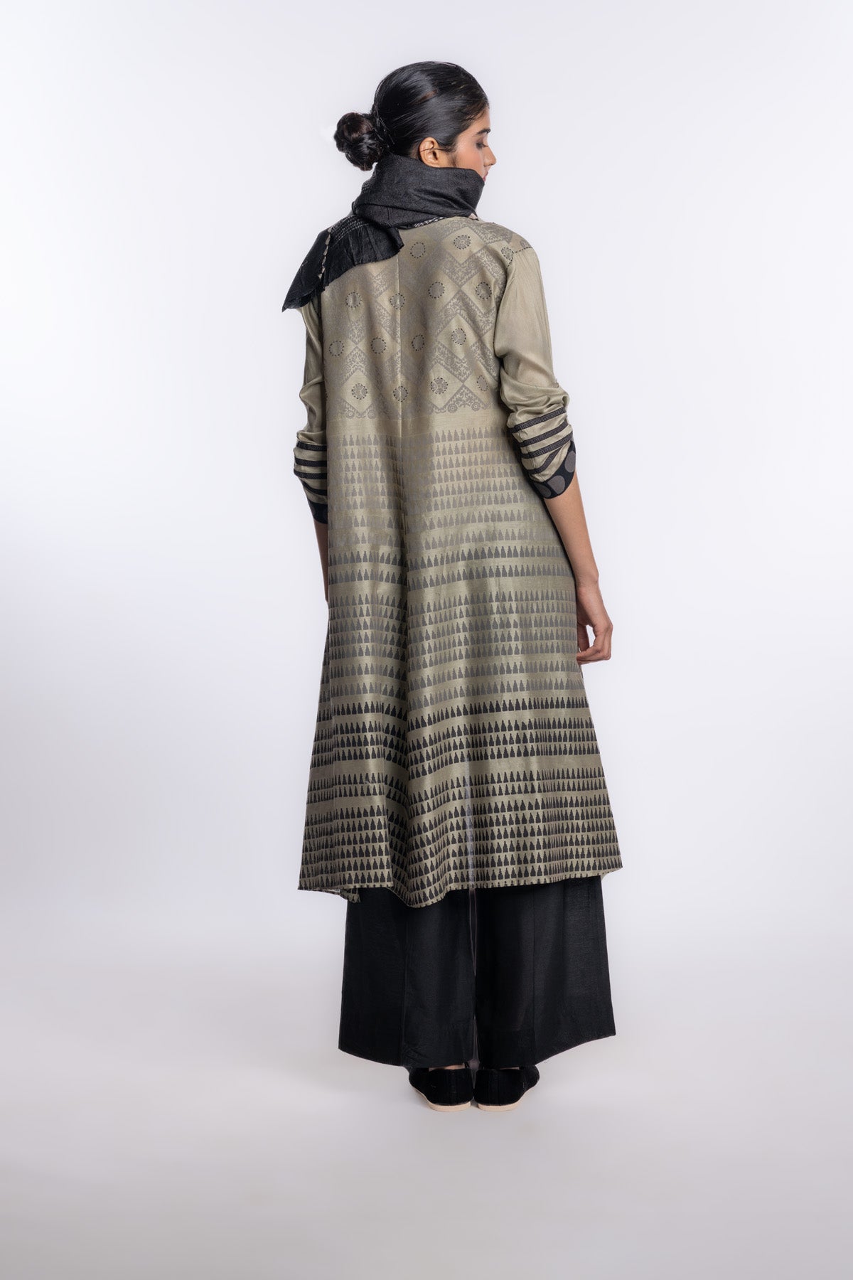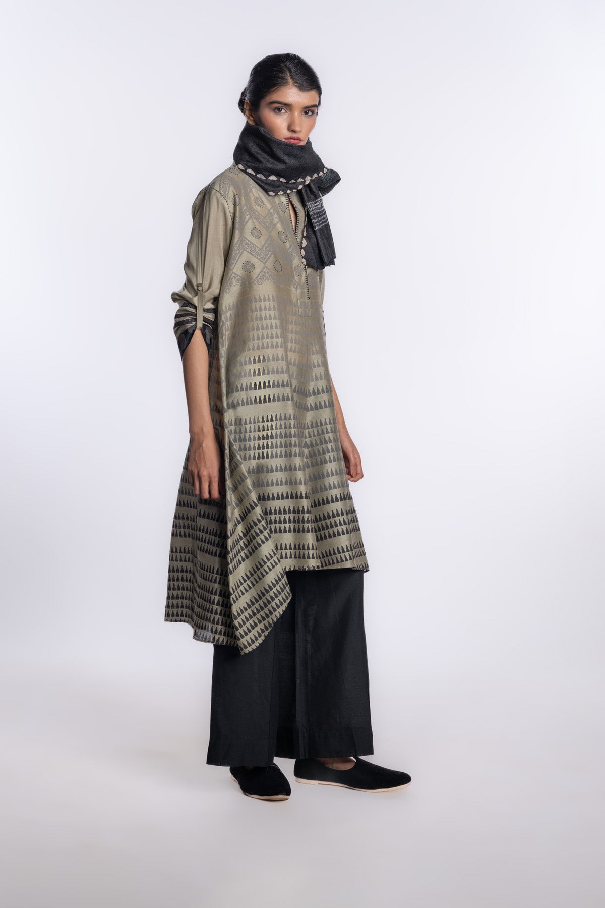 Soft olive asymmetric-hem tunic, accented with rhythmic charcoal hand block prints and graphic striped cuffs. A modern silhouette that blends artisanal detail with understated sophistication