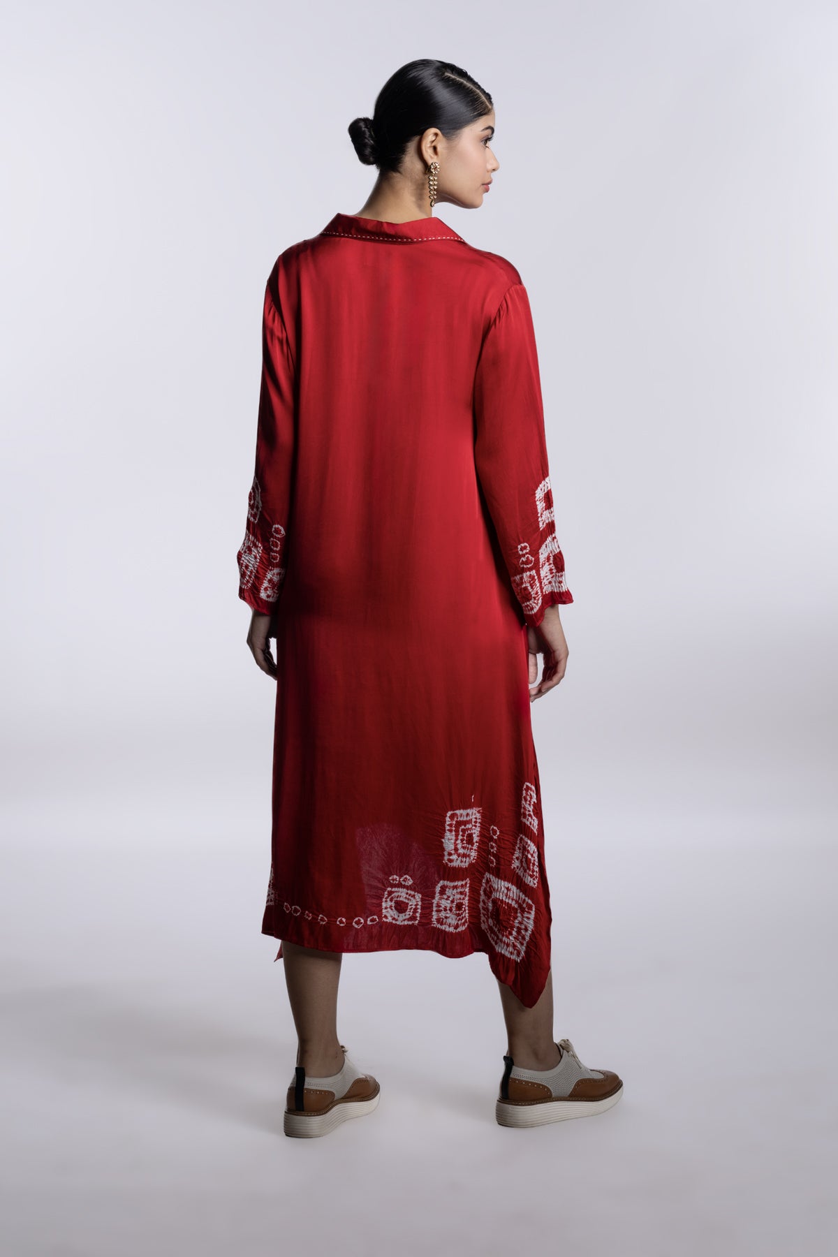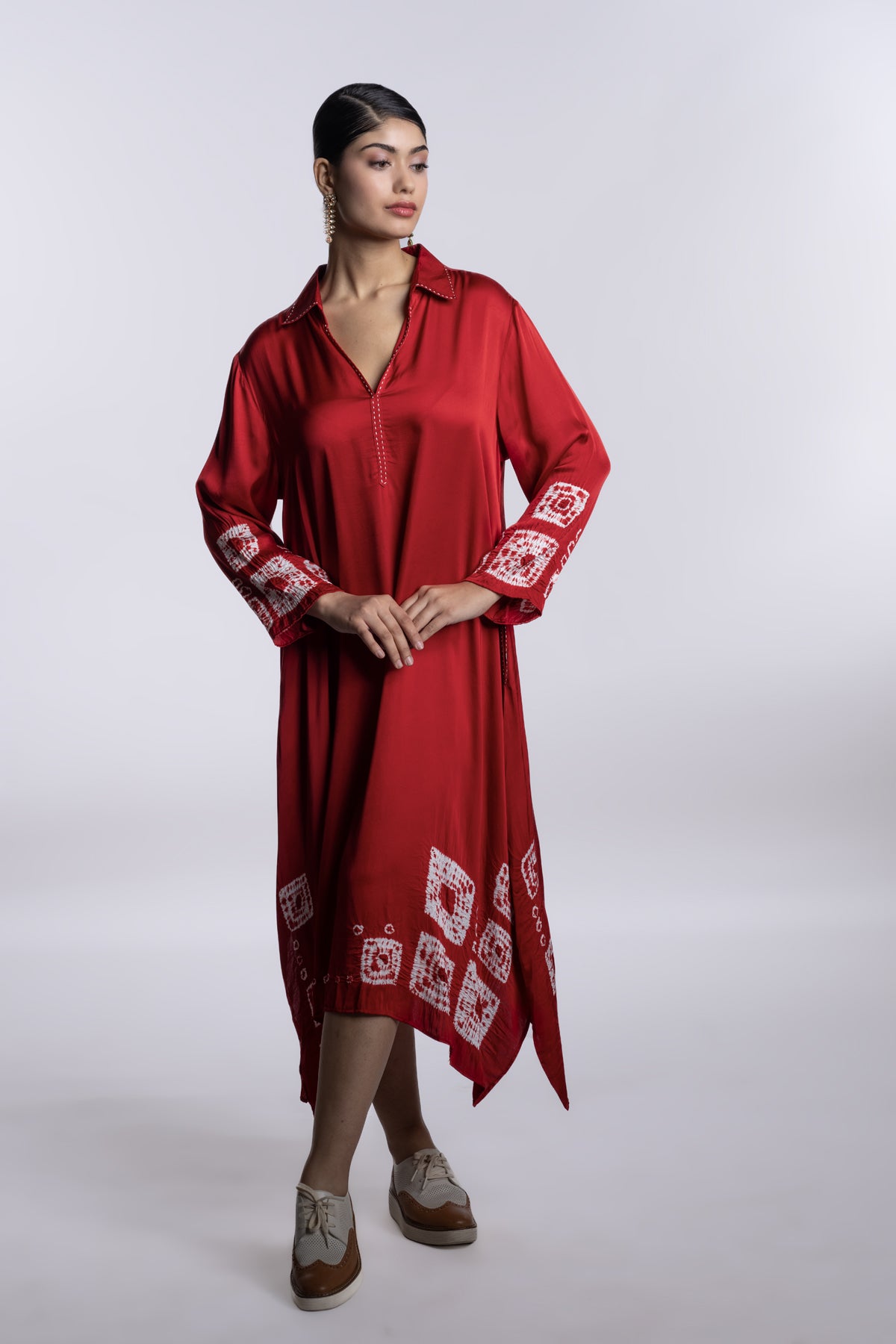 Red easy-fit long tunic dress with a collar, side slits, and a fluid, relaxed silhouette. Accented with geometric shibori motifs and subtle handcrafted surface details.