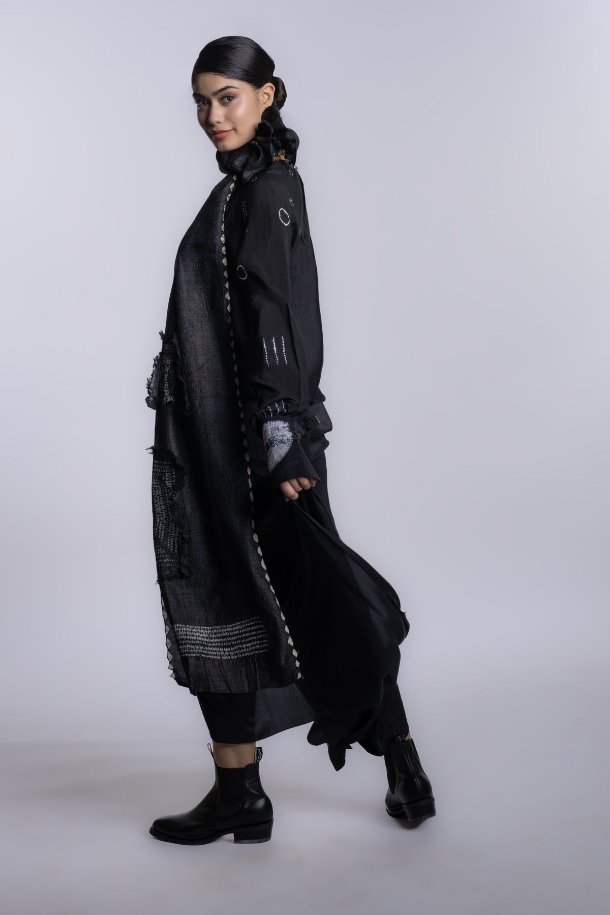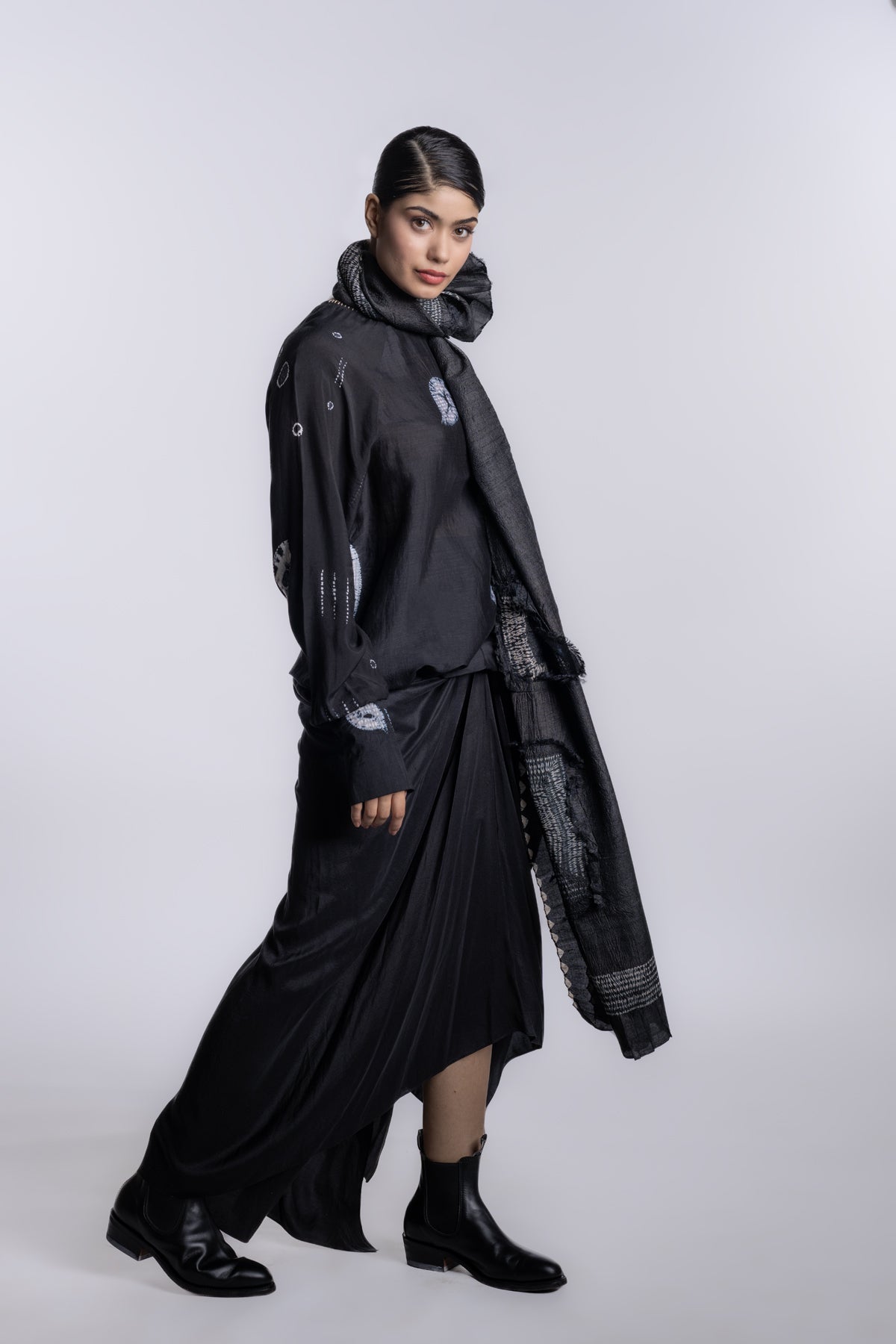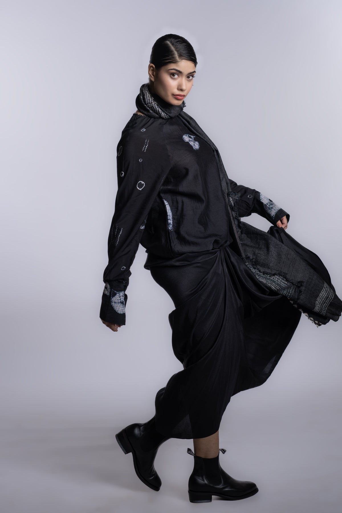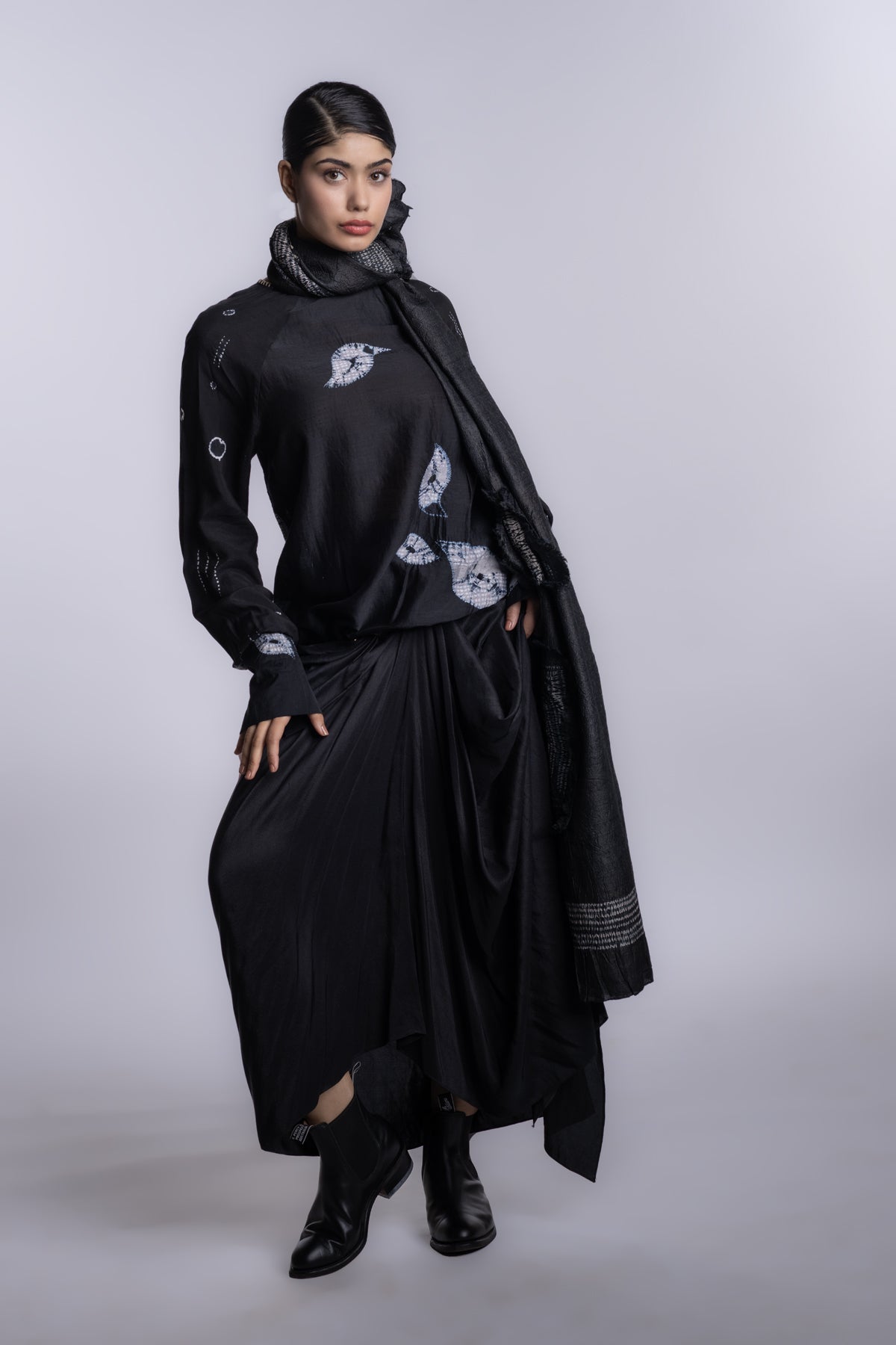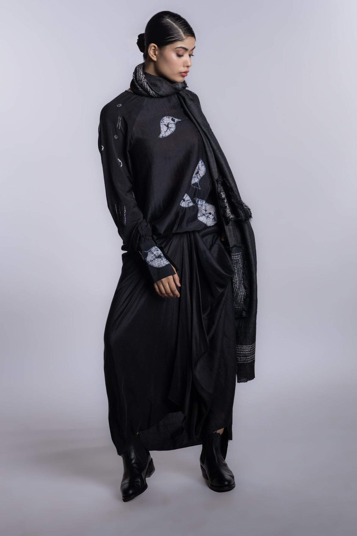 Black boat-neck long-sleeve blouse with a fluid, streamlined silhouette.Accented with asymmetrical shibori placement and subtle handcrafted texture details.