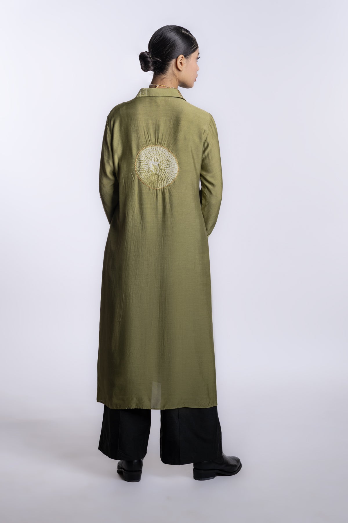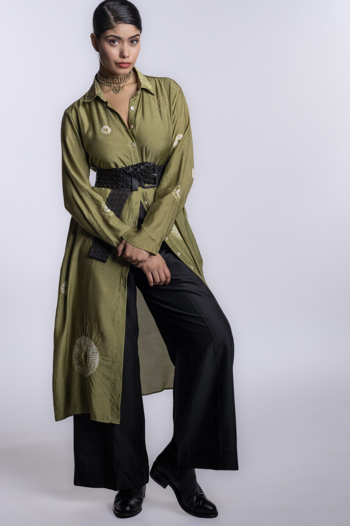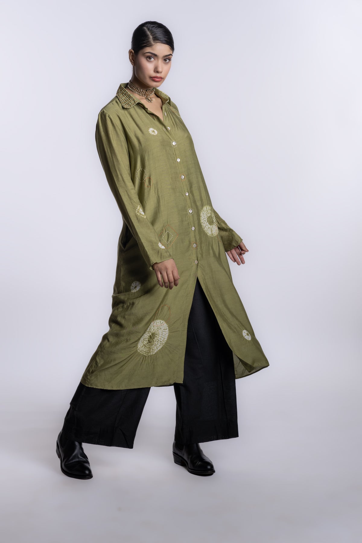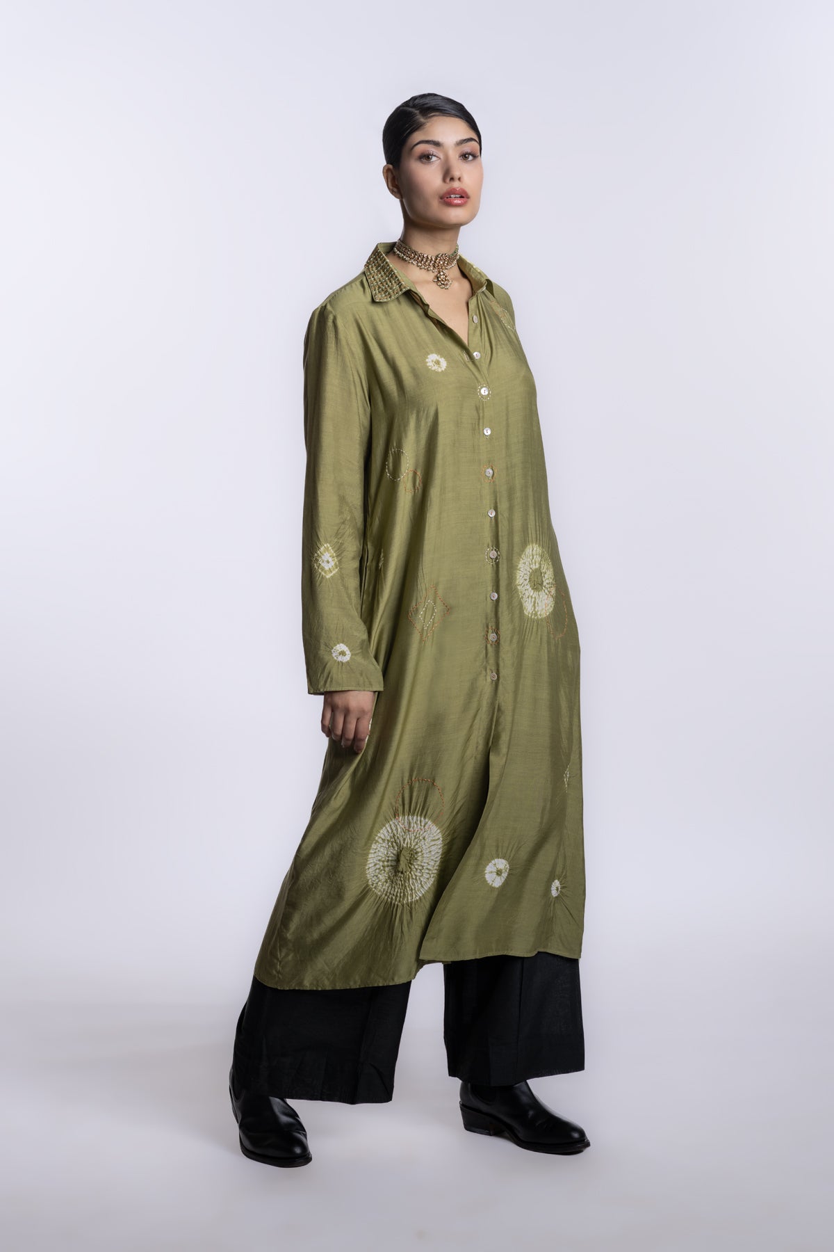 Olive green long tunic shirt with a collar and a relaxed, fluid silhouette. Accented with scattered shibori motifs and subtle handcrafted surface details