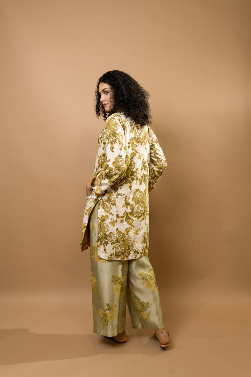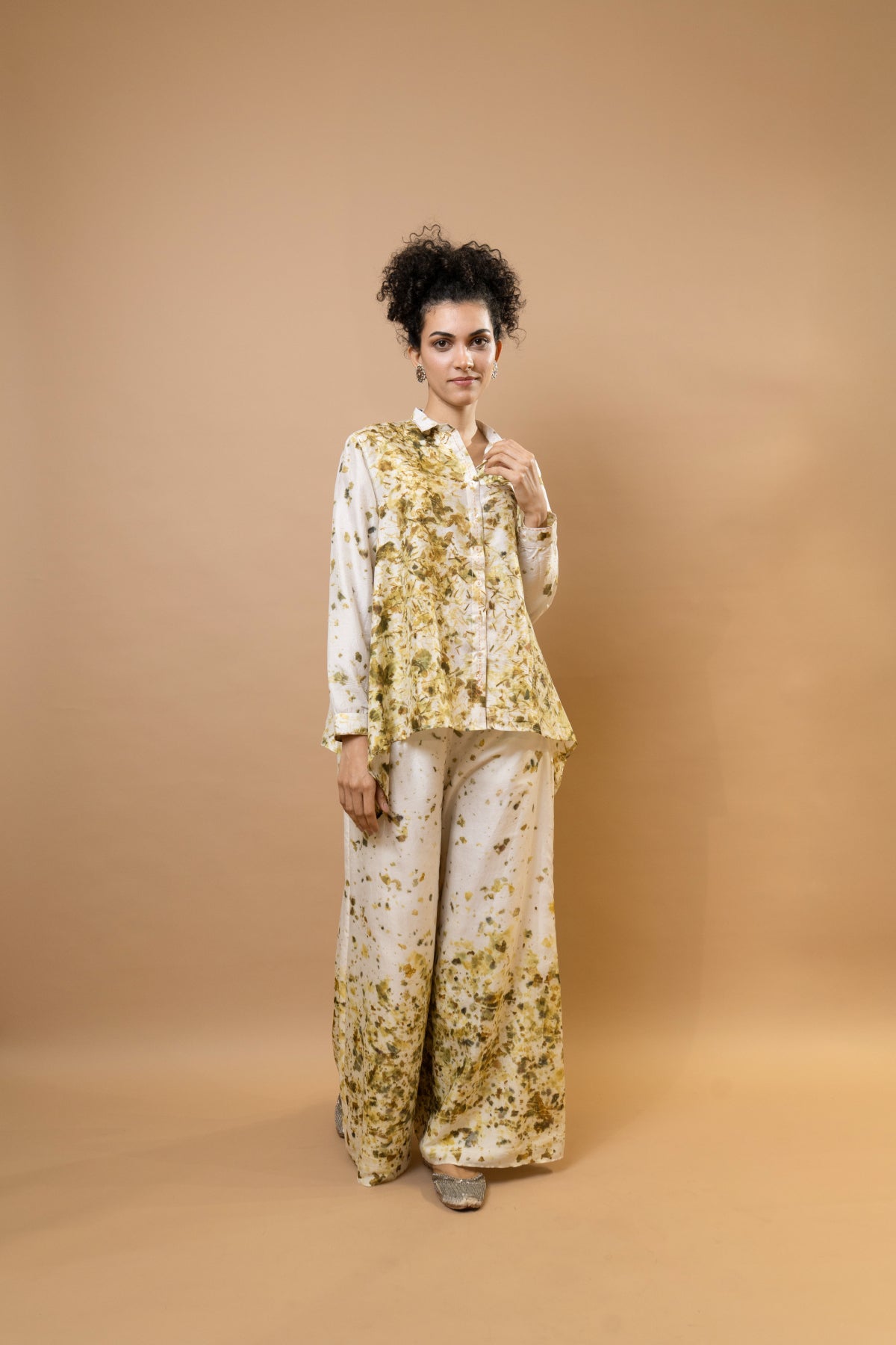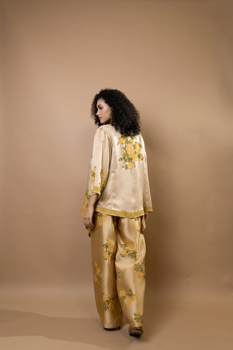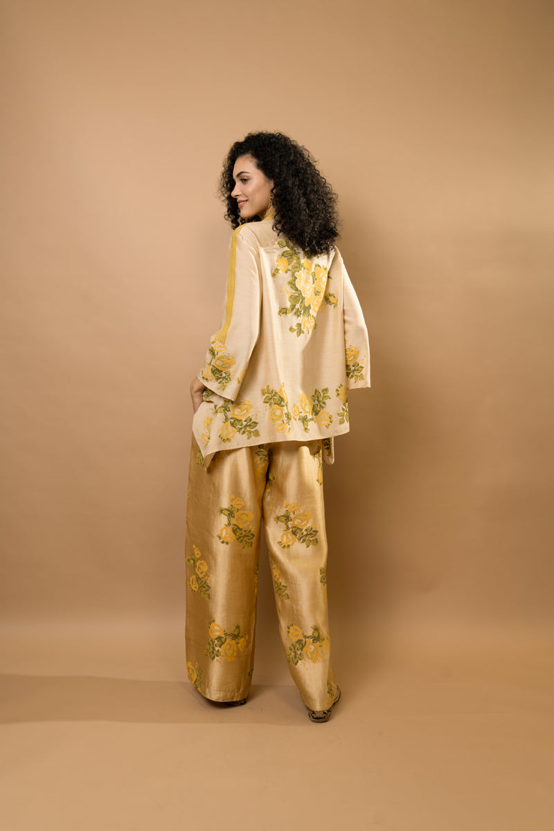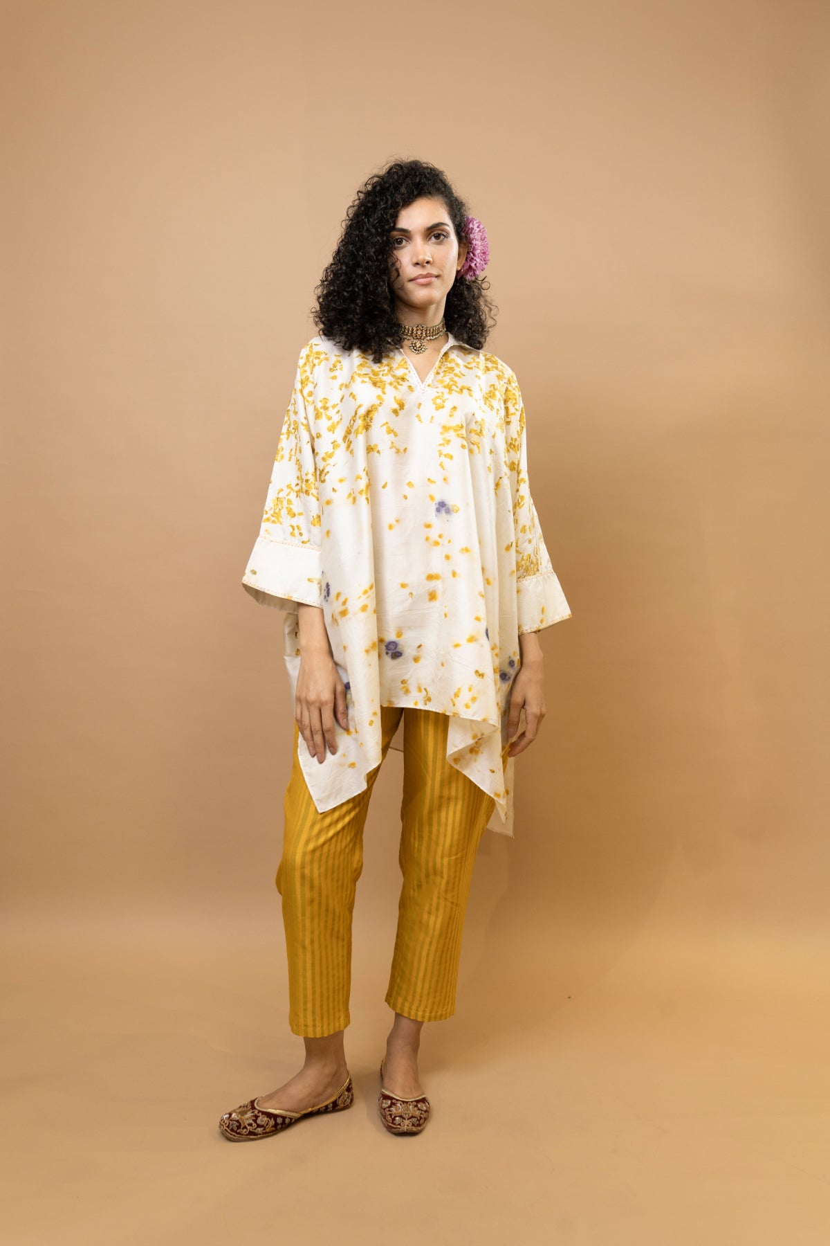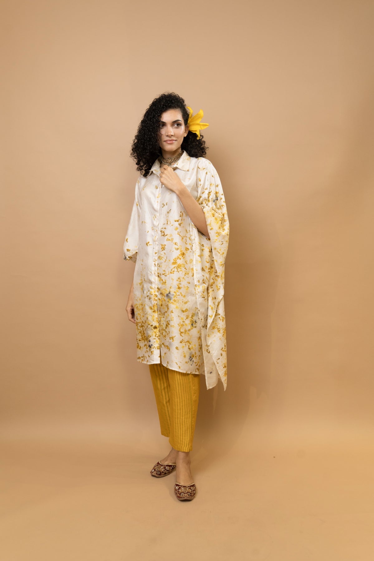 Ivory & Marigold Yellow Pure Silk Floral Printed One-Shoulder Shirt Tunic Set