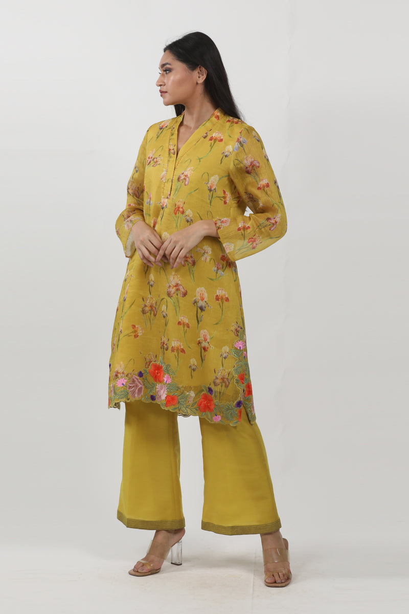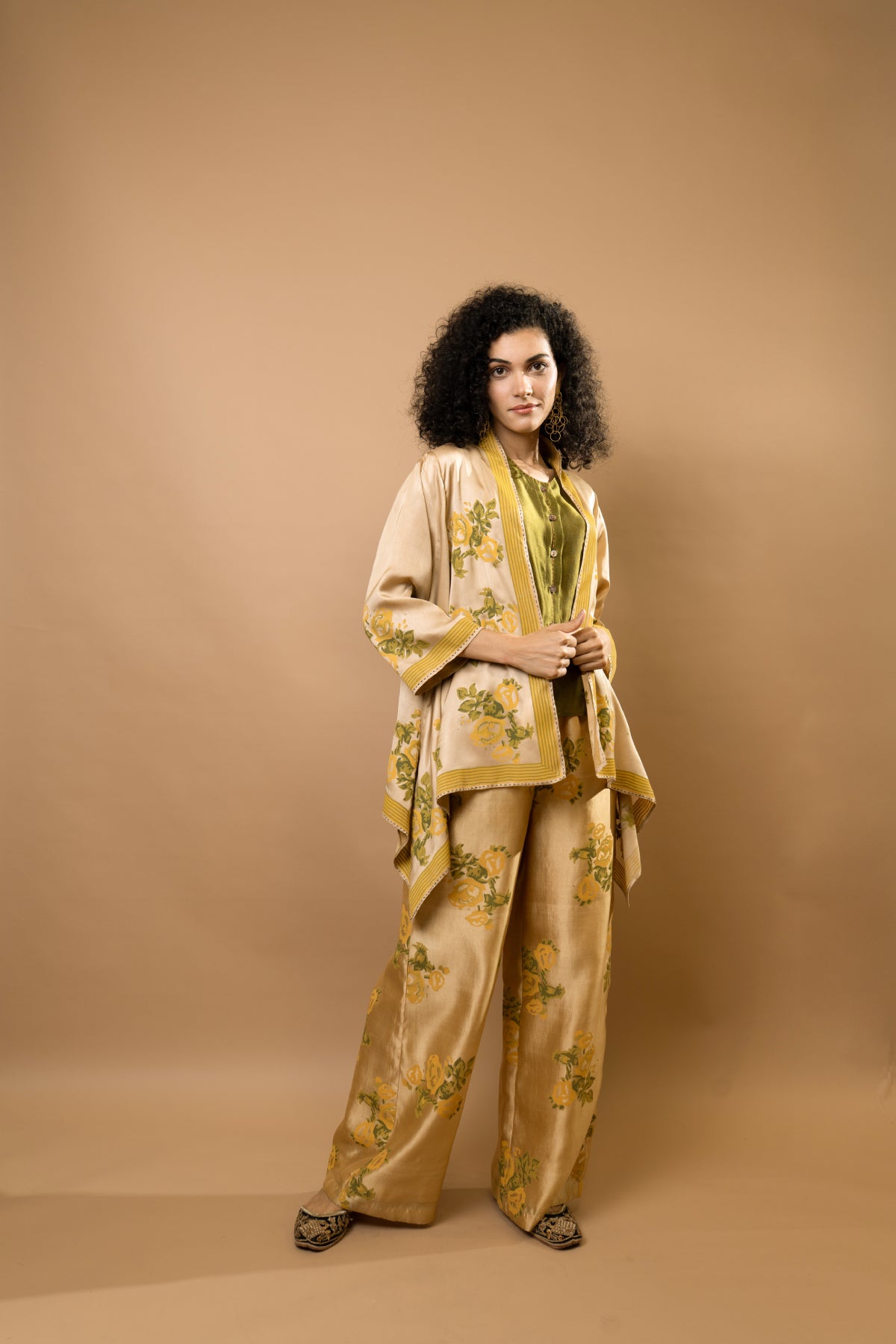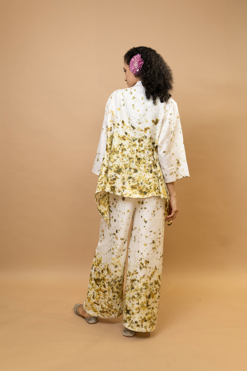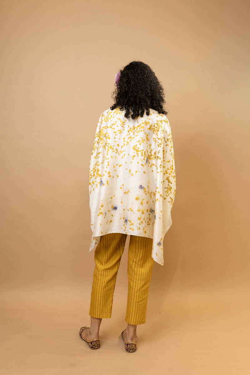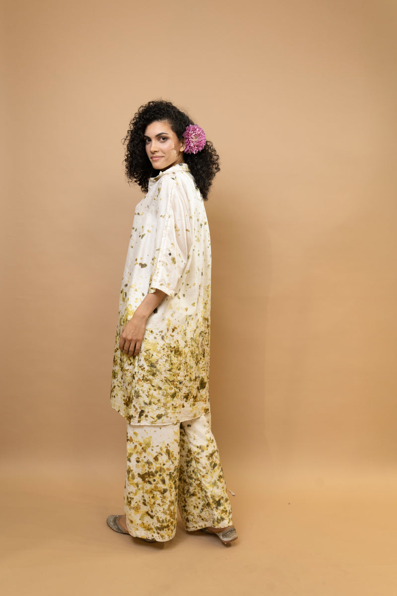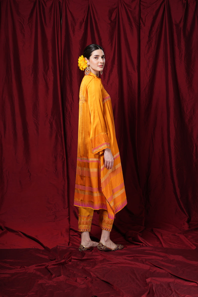 Ivory & Marigold Yellow Pure Silk Floral Printed One-Shoulder Shirt Tunic Set