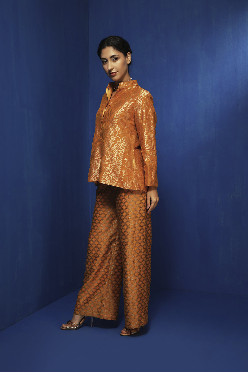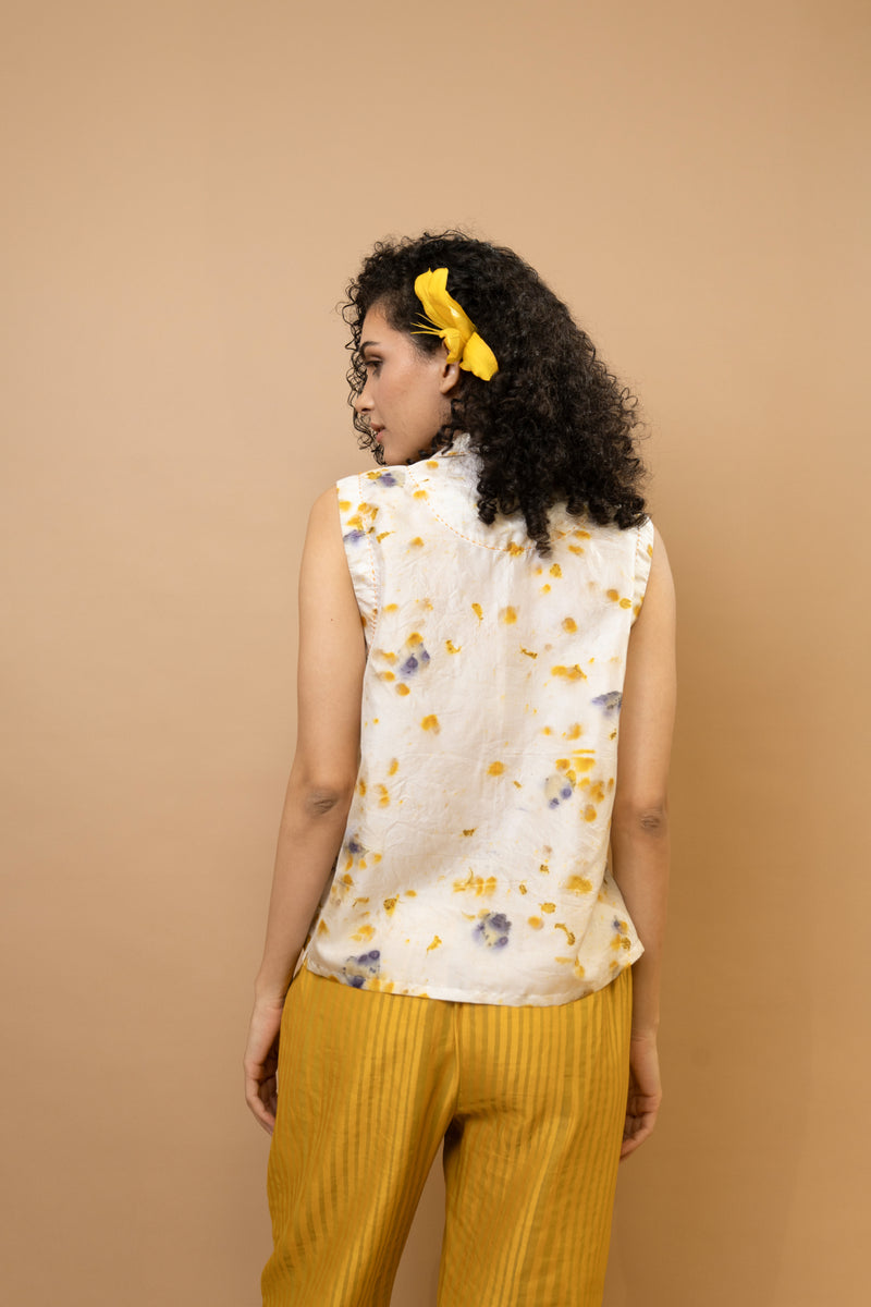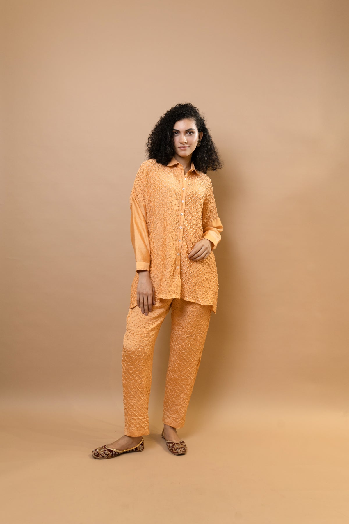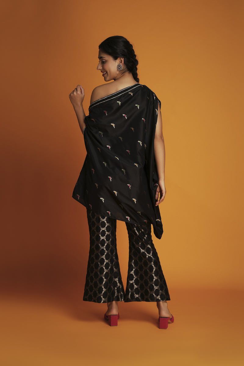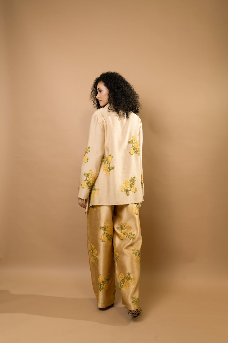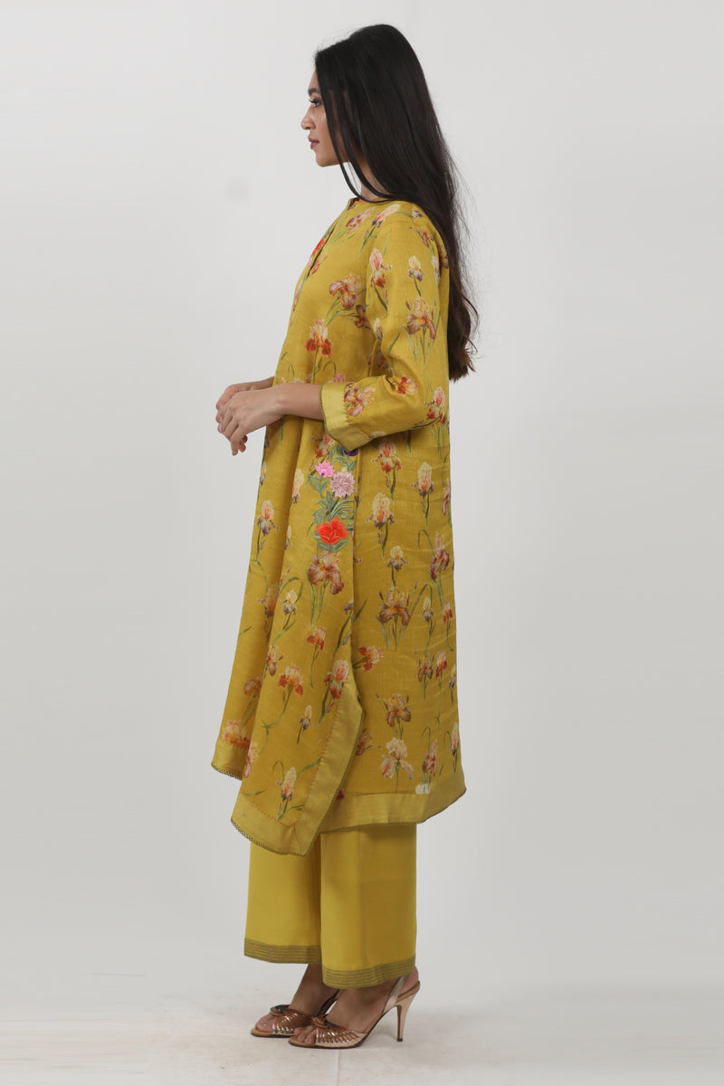 Ivory & Marigold Yellow Pure Silk Floral Printed One-Shoulder Shirt Tunic Set