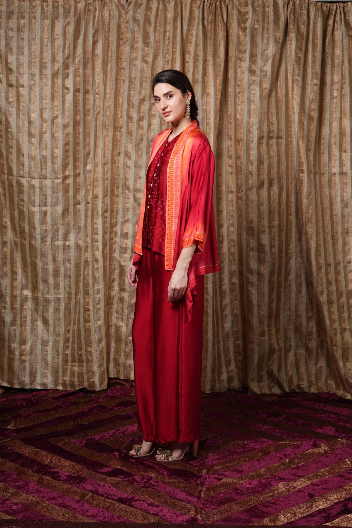 A fiery red block-printed tank top with fine dotted motifs, paired with an ombré open jacket in orange and red.The jacket features intricate linear borders that frame the ensemble with artisanal elegance