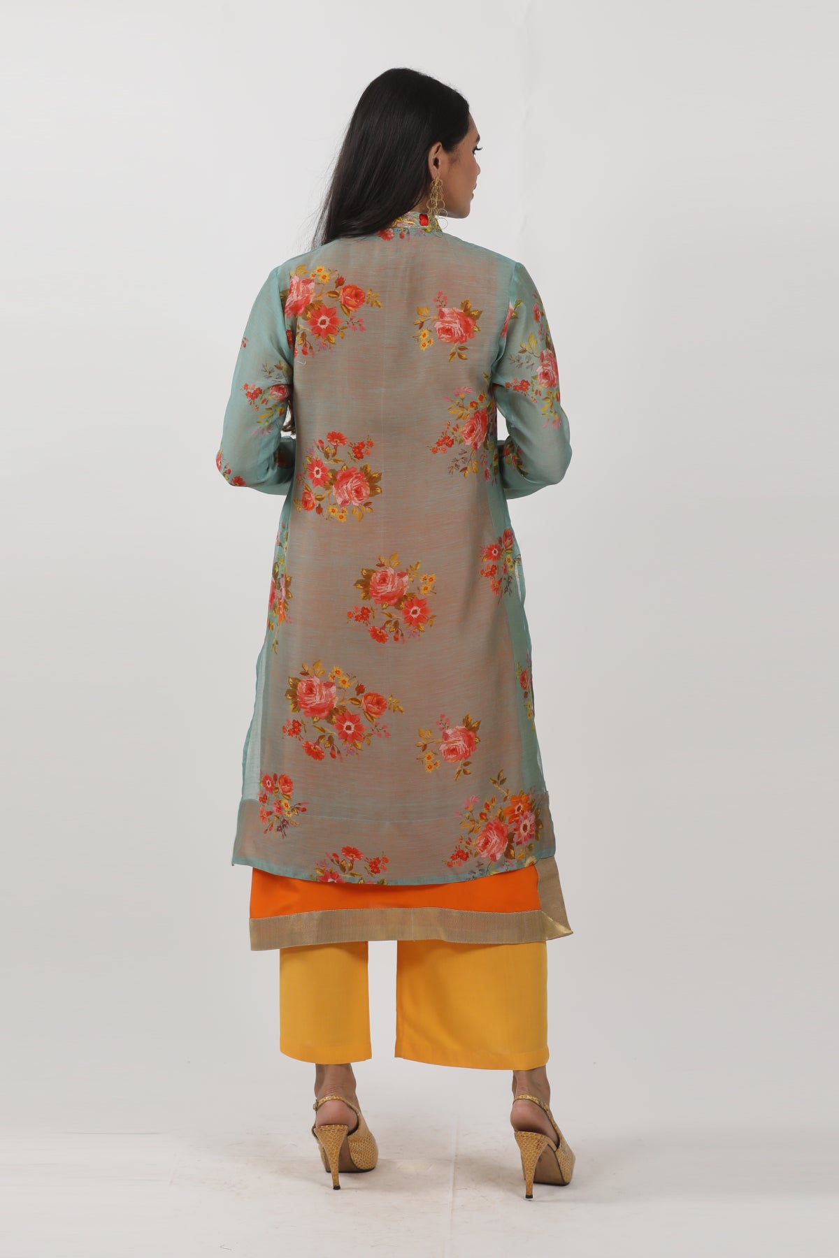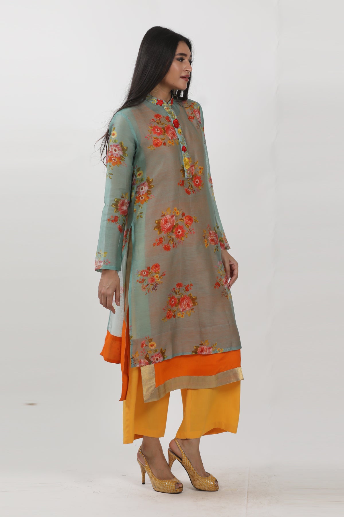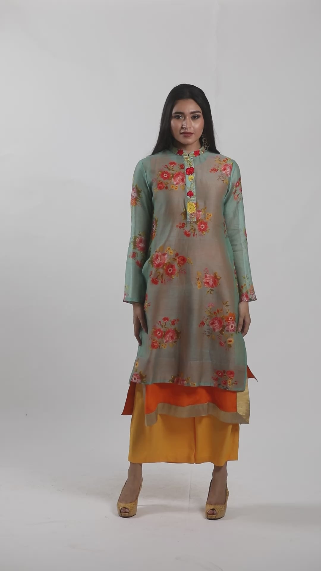 Green Floral printed Tunic in Hand Woven Banrasi Cotton Slik Fabric with floral embroidery around band collar & placket paired with inner Contrast Tunic & wide Pants.