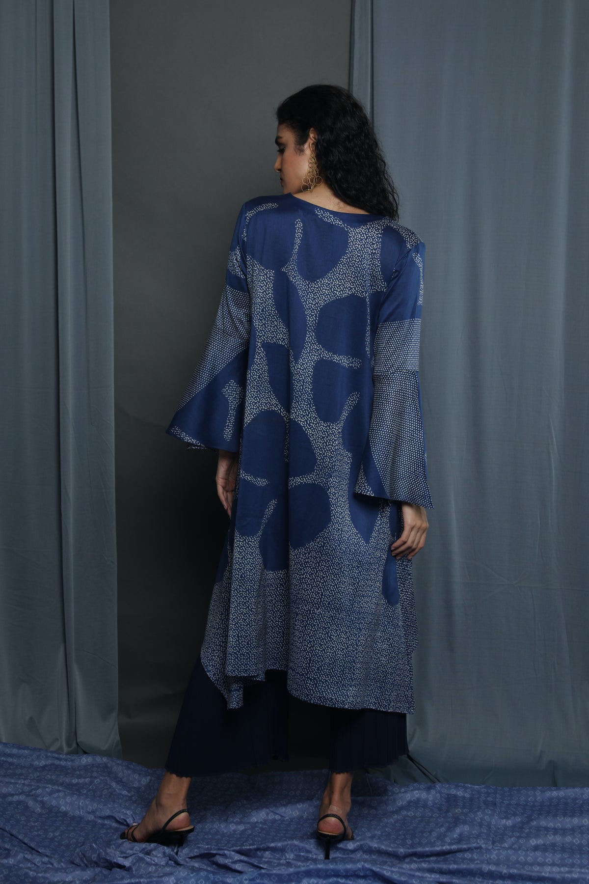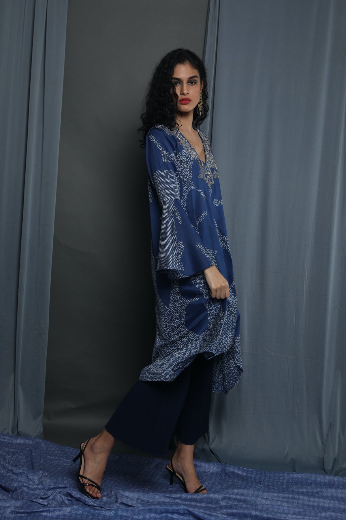 Indigo block printed asymmetric tunic with hand embroidery enhanced V neck line in breathable chanderi. Paired with navy wide pants.
