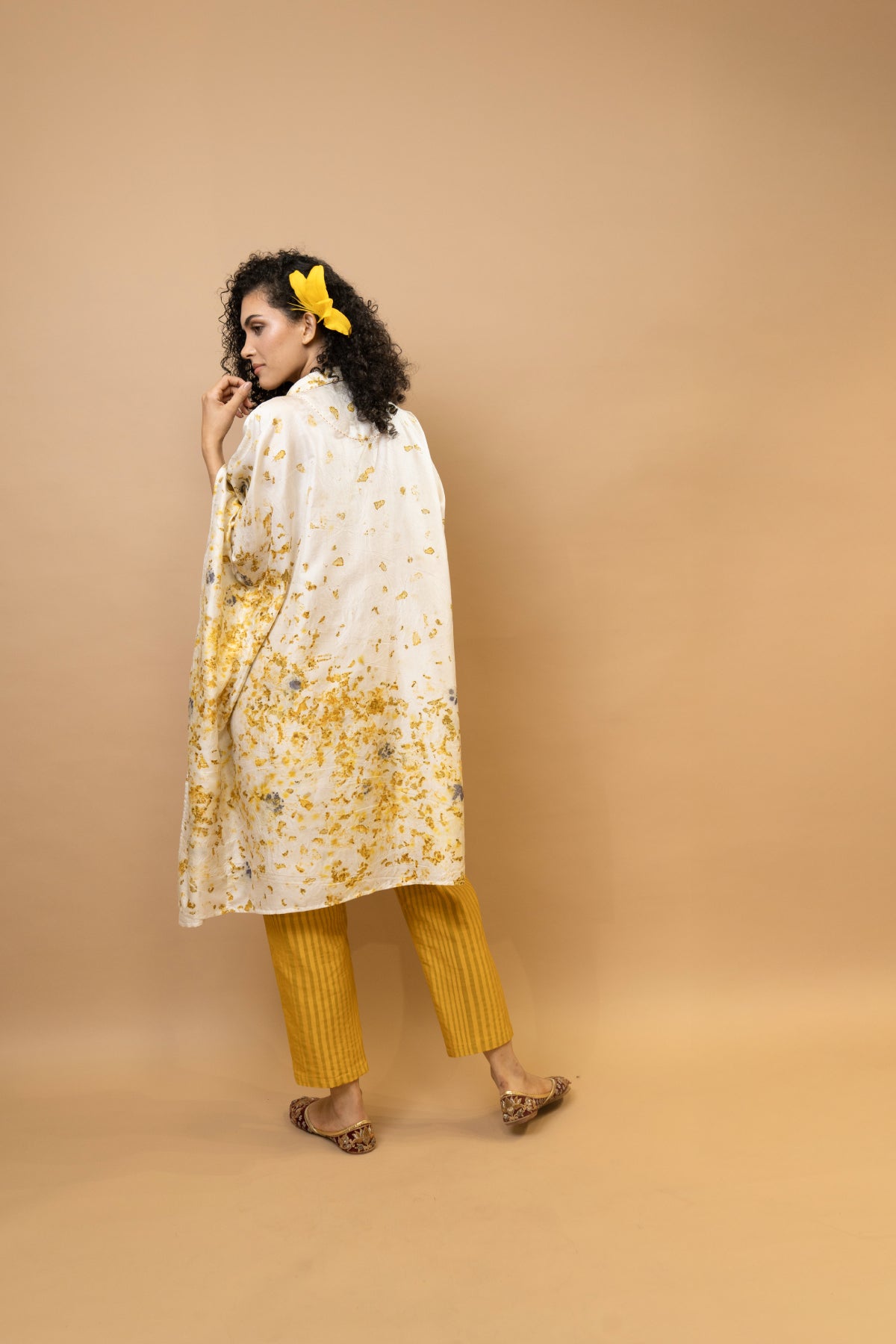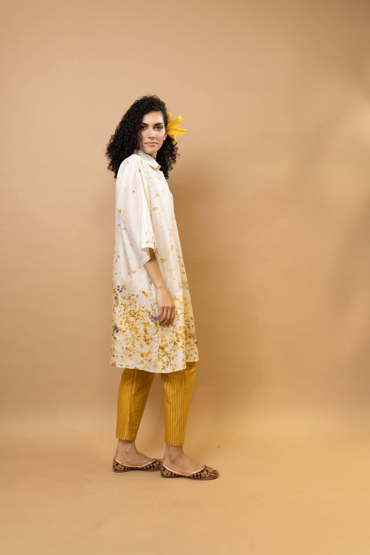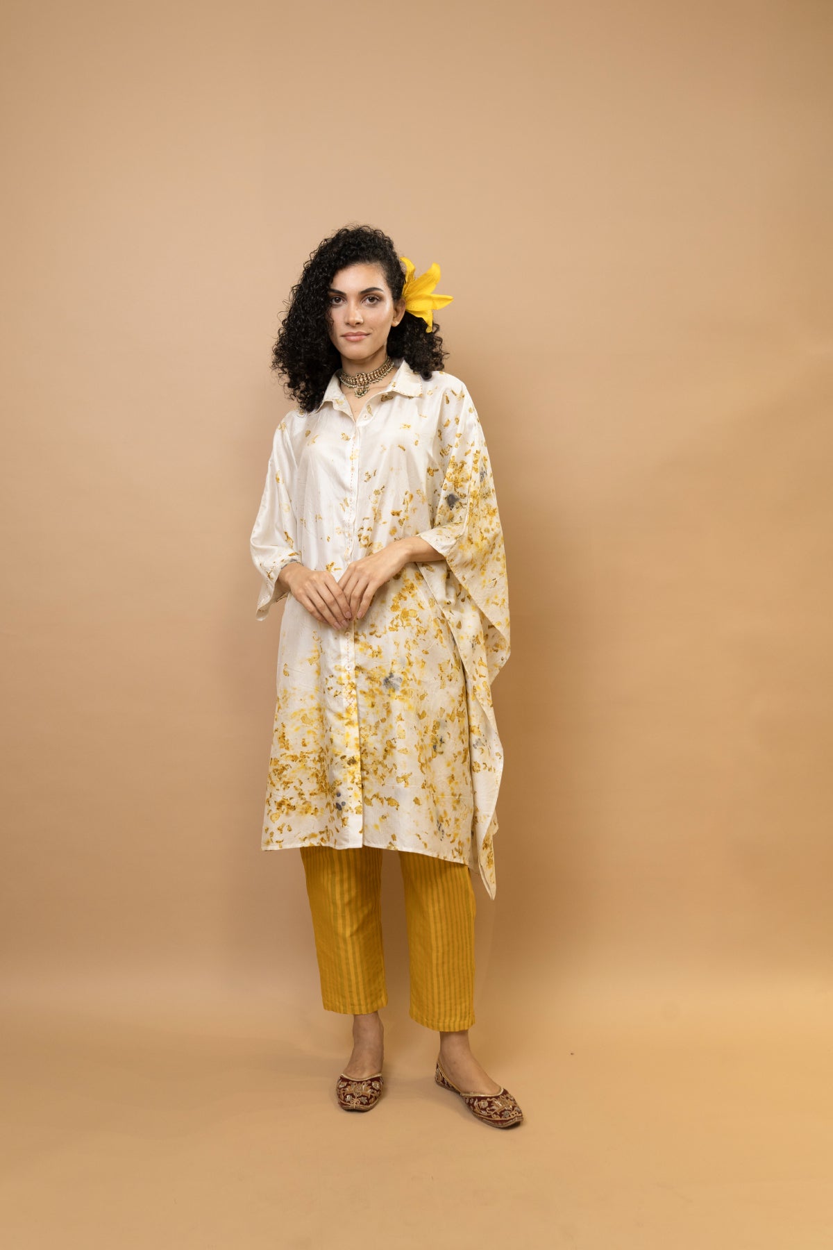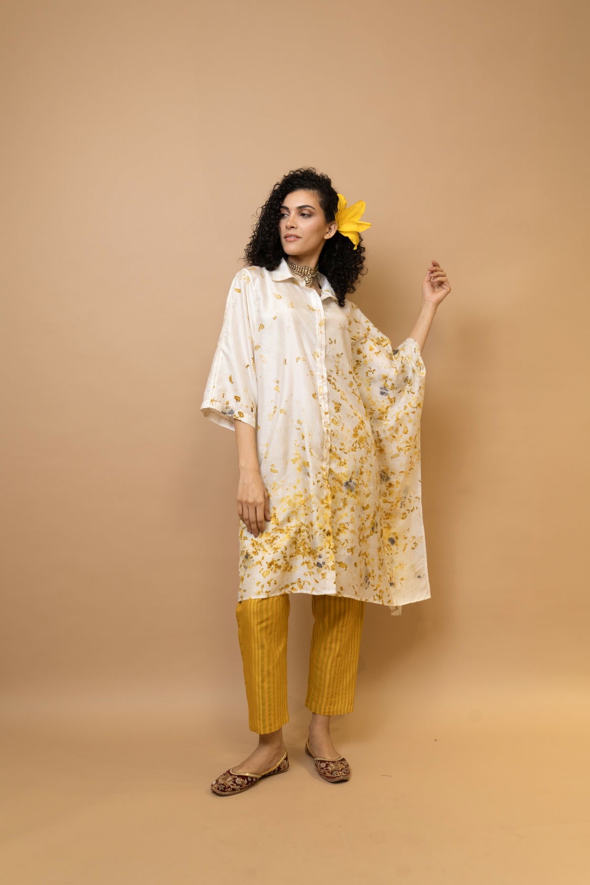 Ivory & Marigold Yellow Pure Silk Floral Printed One-Shoulder Shirt Tunic Set