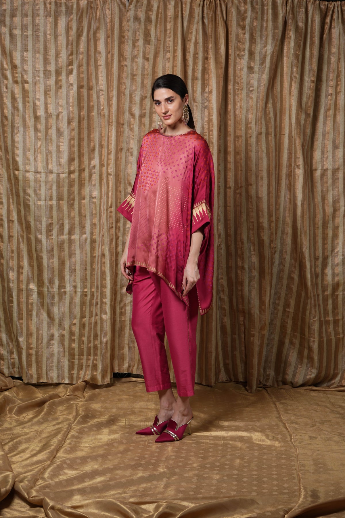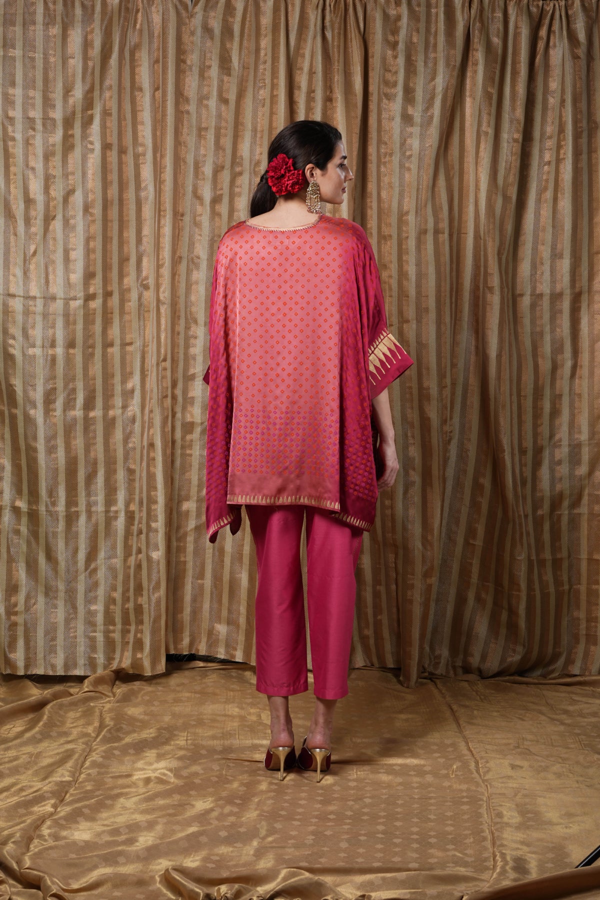 An ombre coral block-printed kaftan with delicate geometric patterns and contrast cuff detailing. Its relaxed, asymmetrical silhouette drapes gracefully with artisanal charm