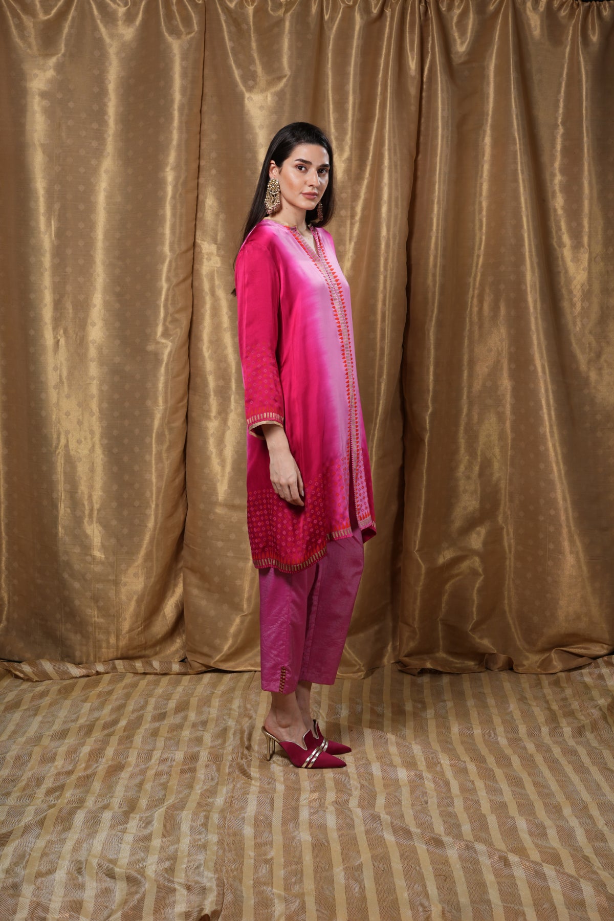 A radiant pink block-printed tunic jacket with a soft ombré fade and intricate detailing along the placket. The straight-cut silhouette and minimal neckline offer a refined, modern look.