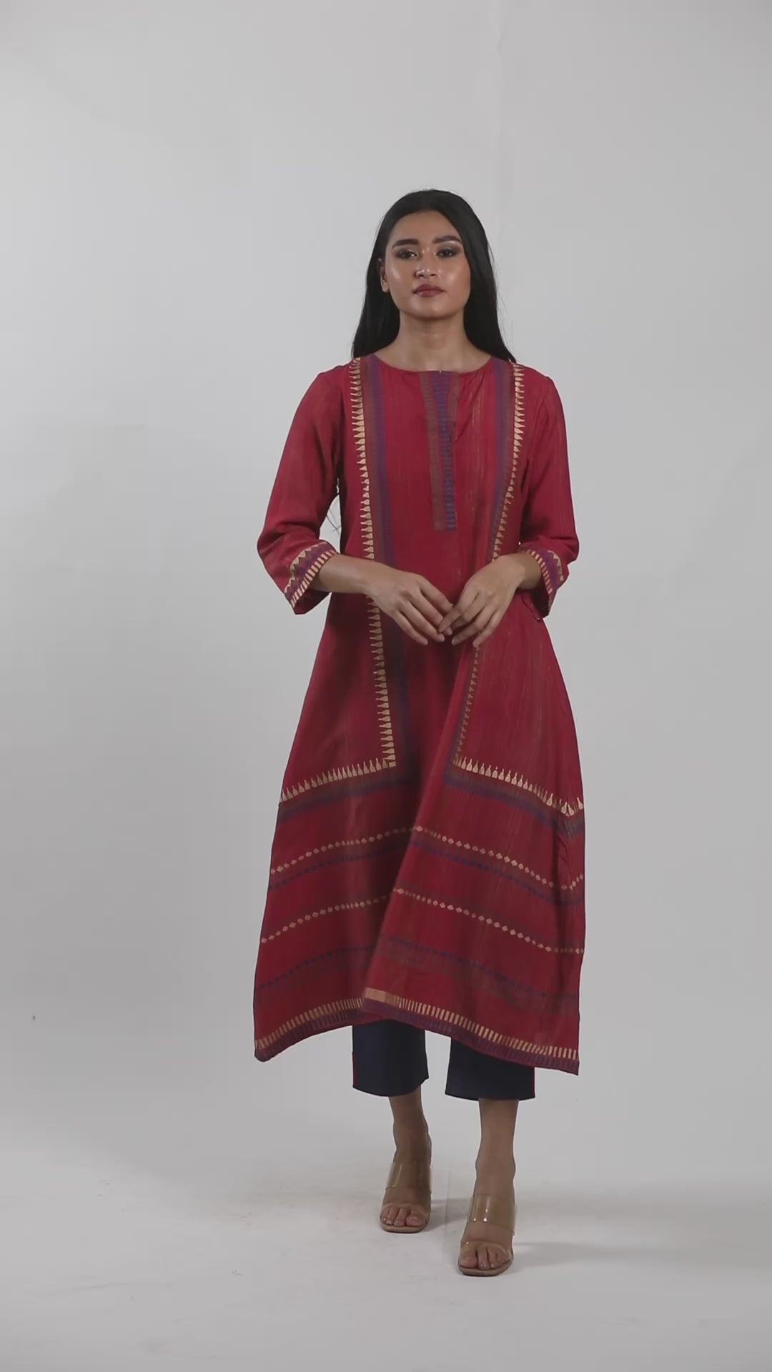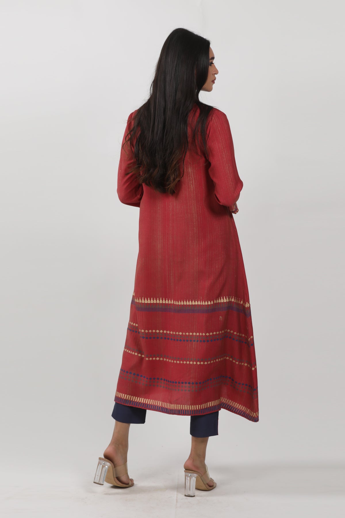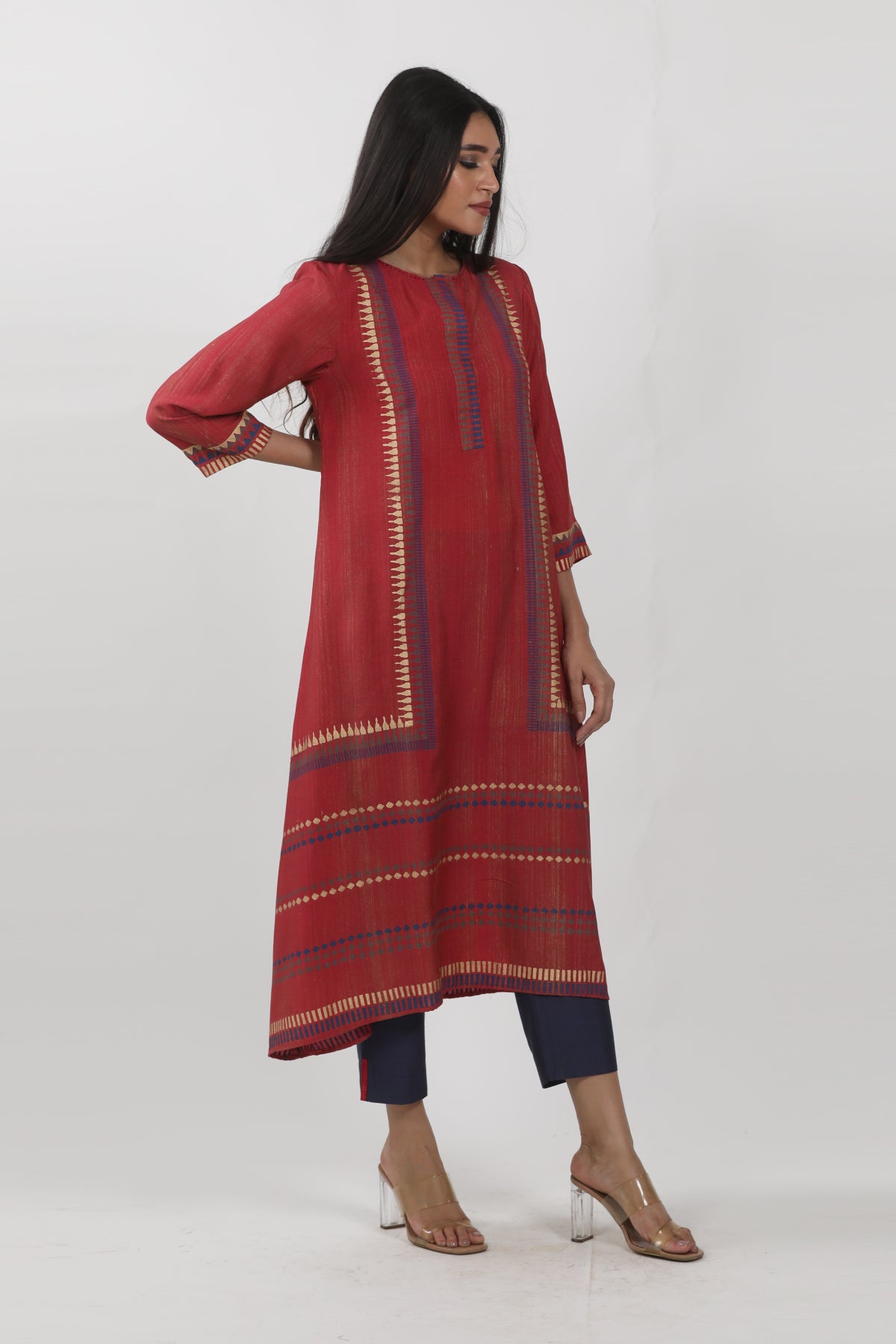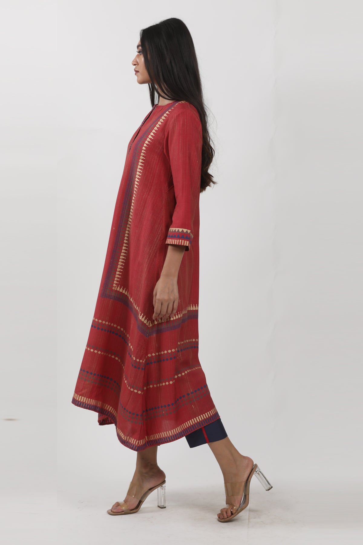 Red engineered Hand Gold Brushed and Block printed A line long sleeves Tunic.