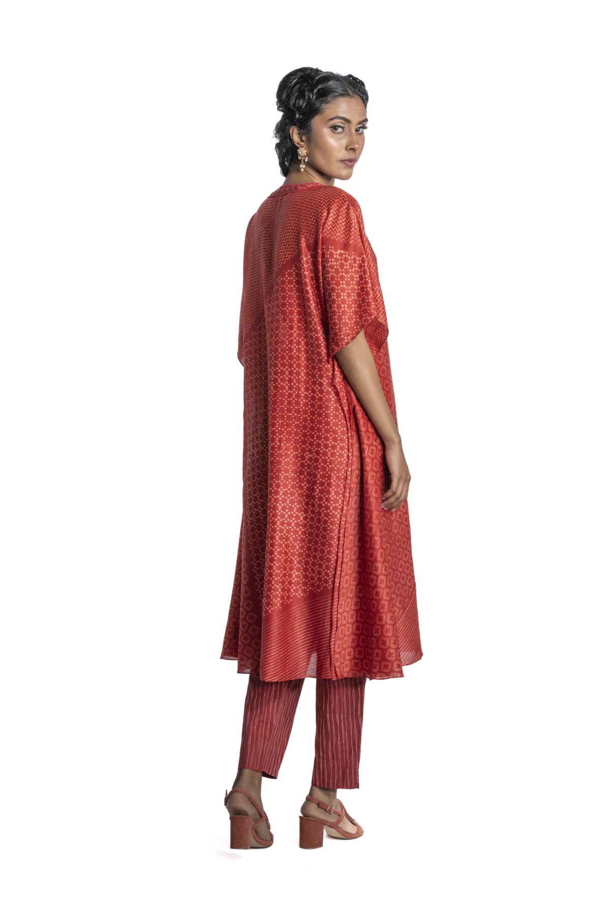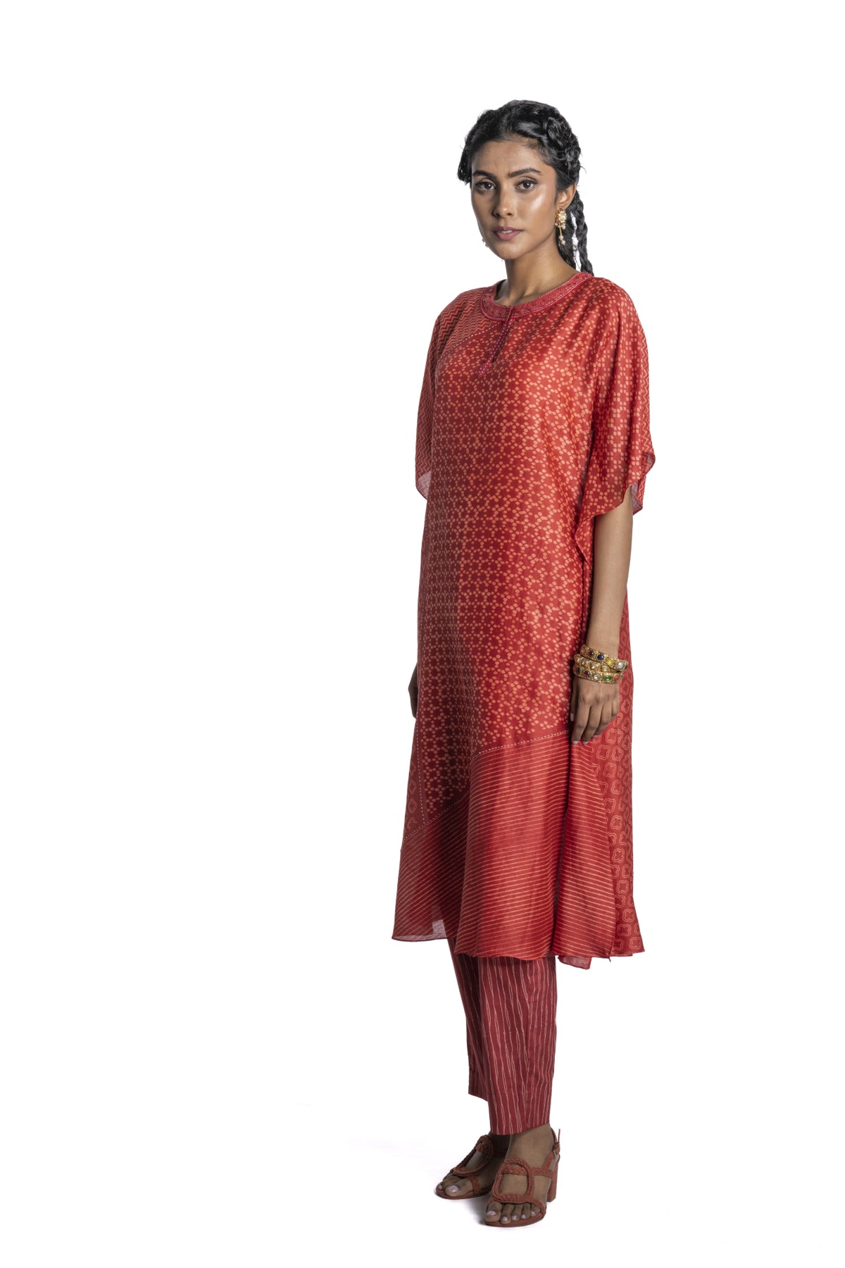 Red Chanderi tunic & pants printed in stripes with hand embroidered neckline.