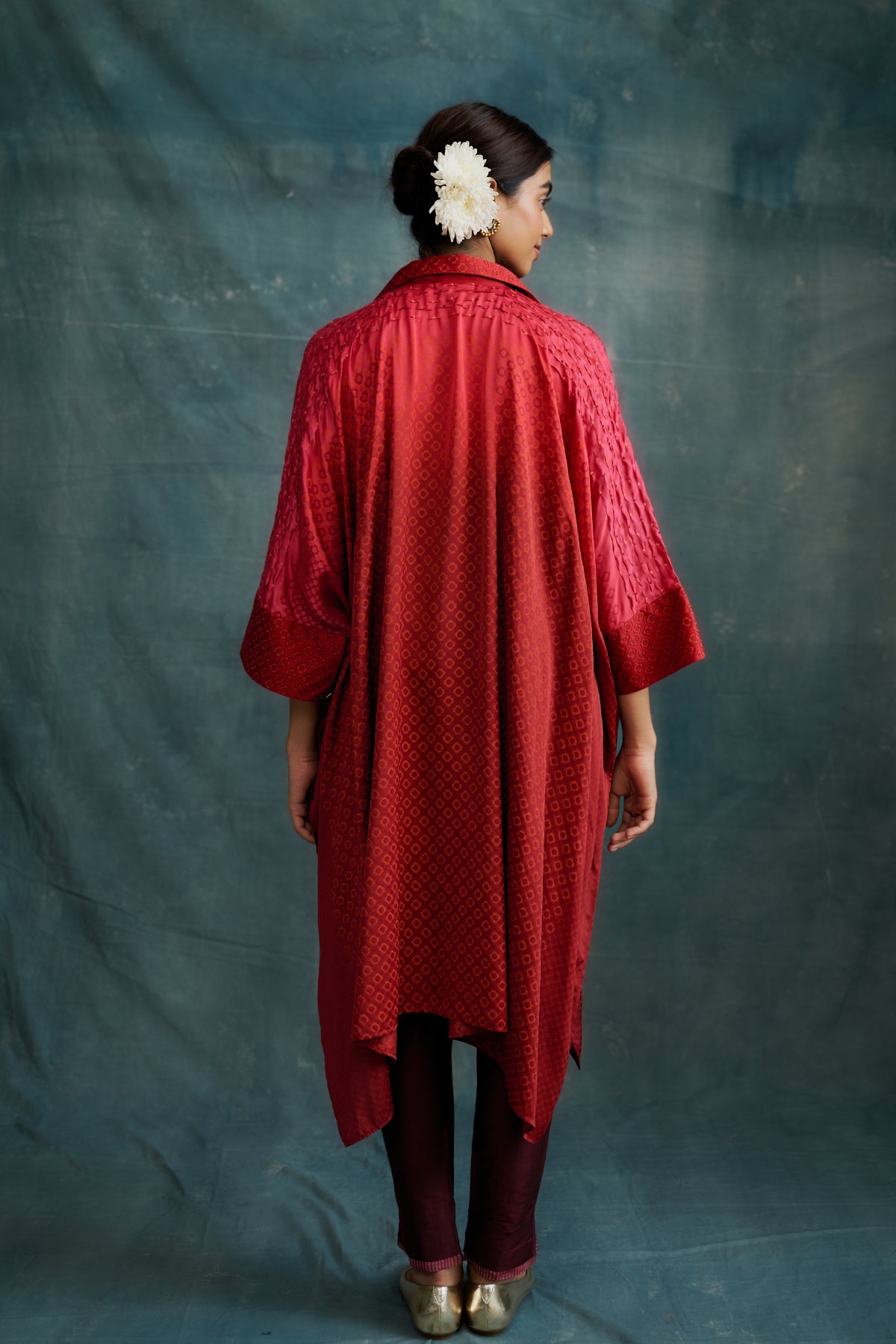 Engineered block-printed red Kaftan drape tunic , featuring knotted embroidery on the shoulders. Embroidered collar and cuffs add an elegant touch.