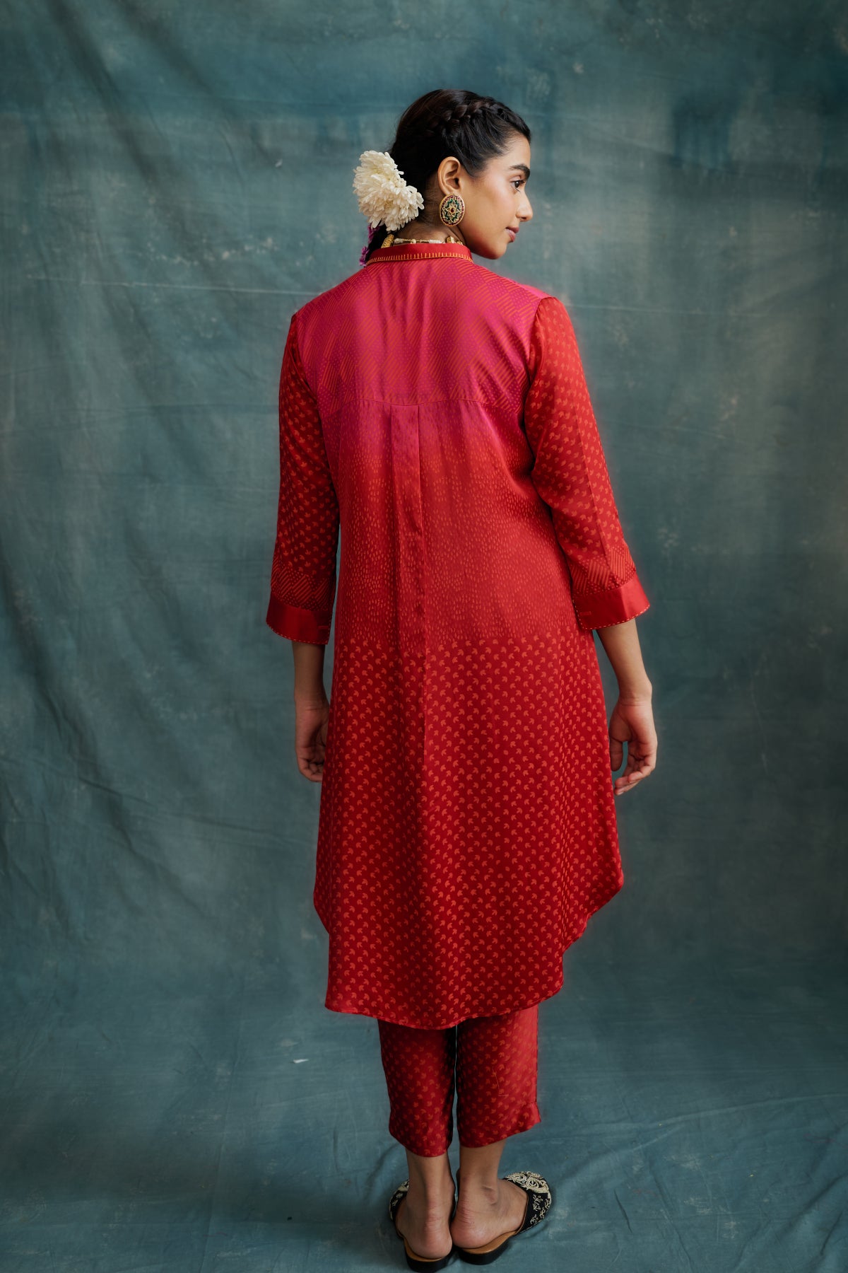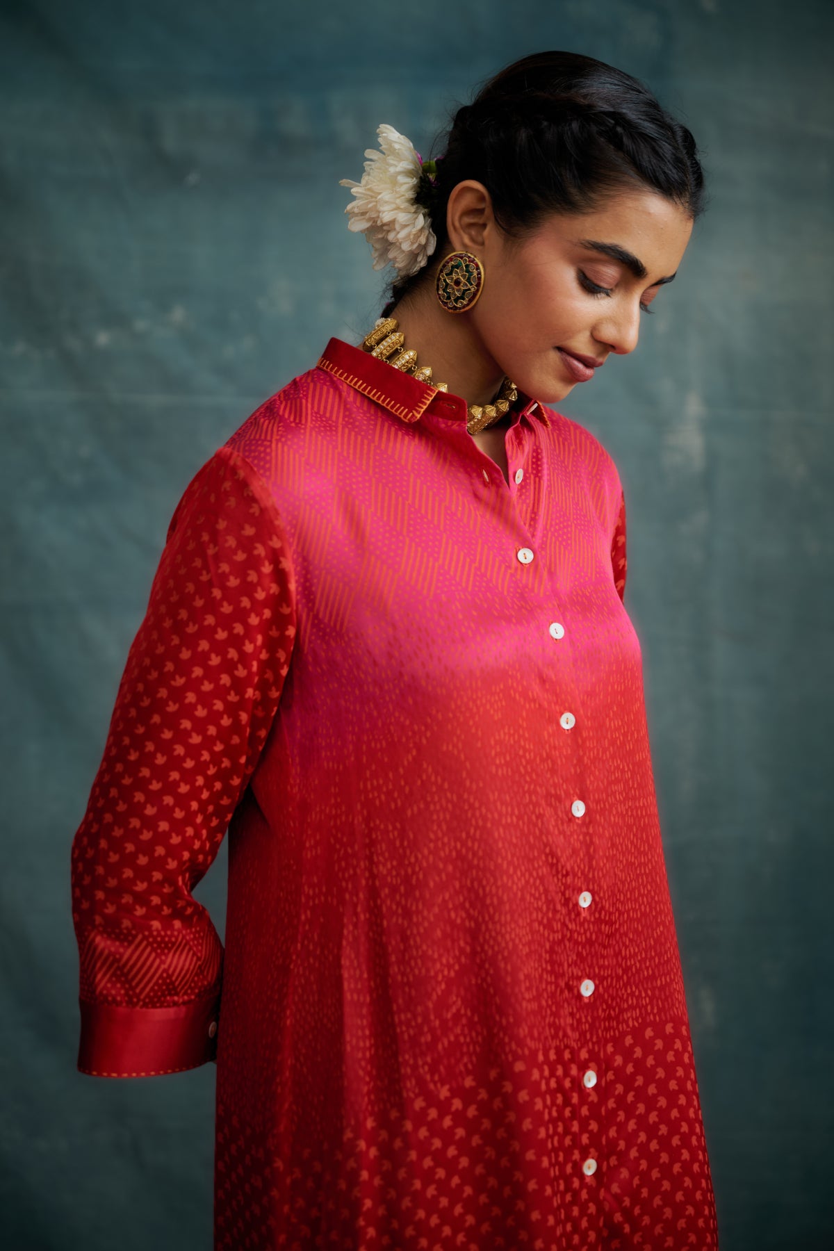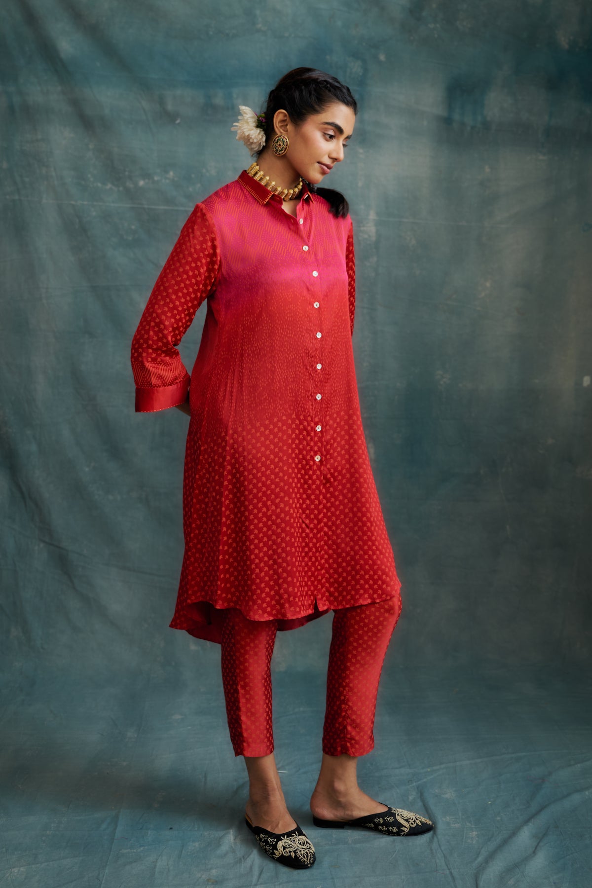 Red Modal Block Printed Shirt Tunic Set