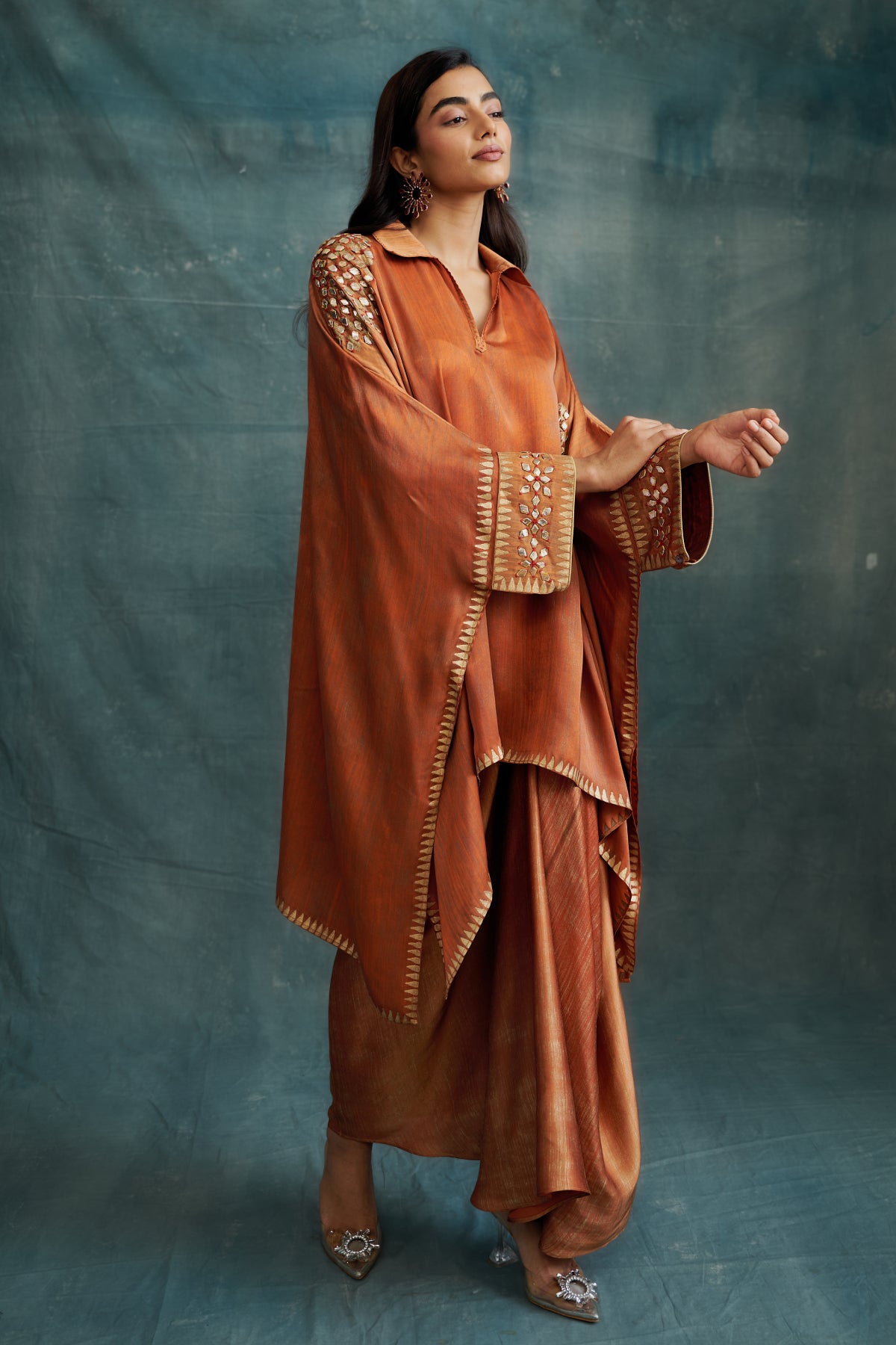 The Rustkaftan tunic is adorned with luxurious gold brushed block prints, while its asymmetric authentic Gota embroidery lends a distinctive charm. Frayed gold trims delicately highlight the neckline, matching drape skirt adding a touch of understated elegance to this refined piece.