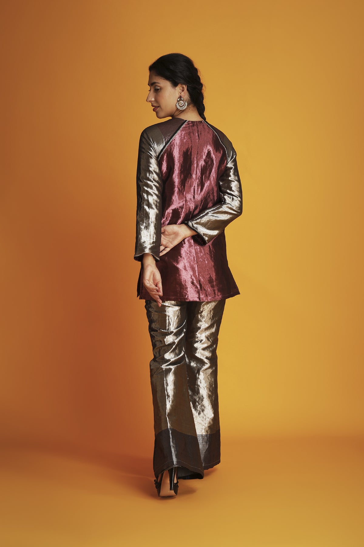 An antique silver and pink handwoven tissue kurti, embellished with antique silver zardozi trims on black tape and silver zardozi buttons, exudes elegance and intricate detailing for a stylish and sophisticated look.