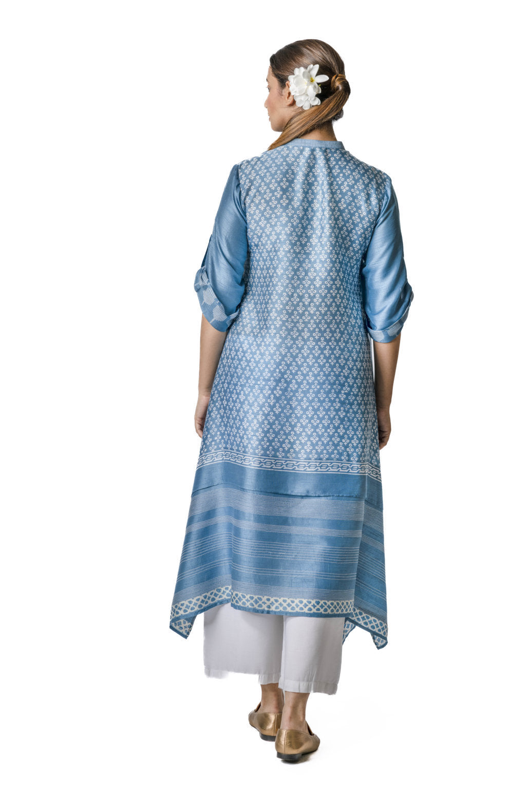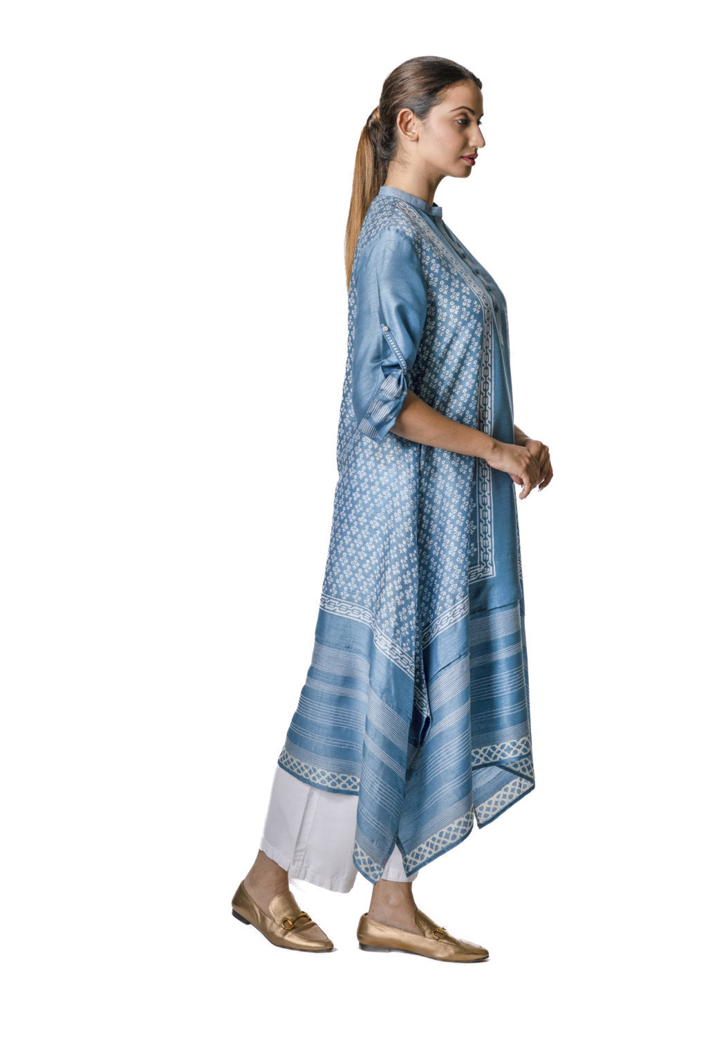 Sky blue asymmetric tussar tunic with striped panels, geometric block print, front buttons & embroidered placket.