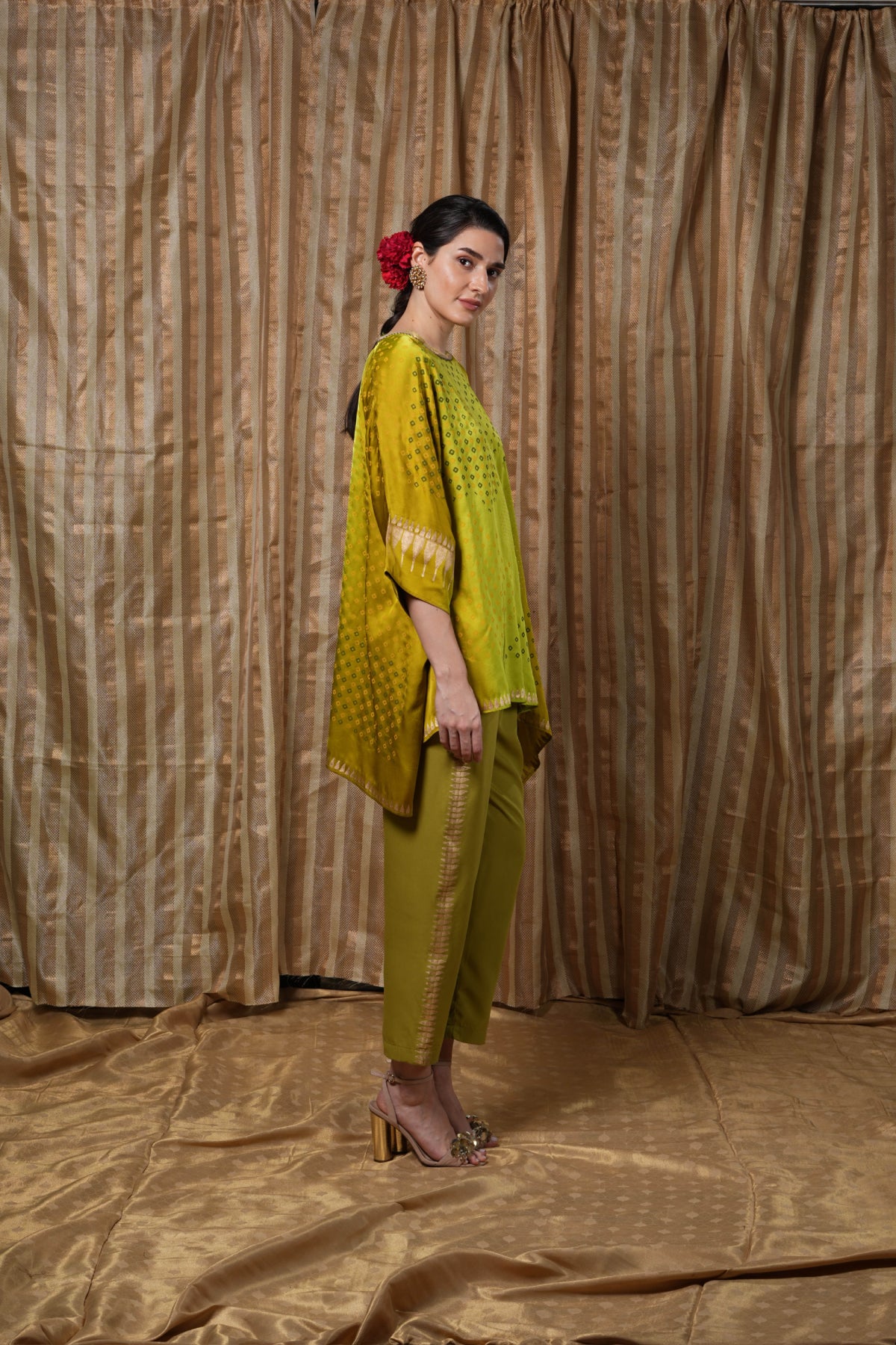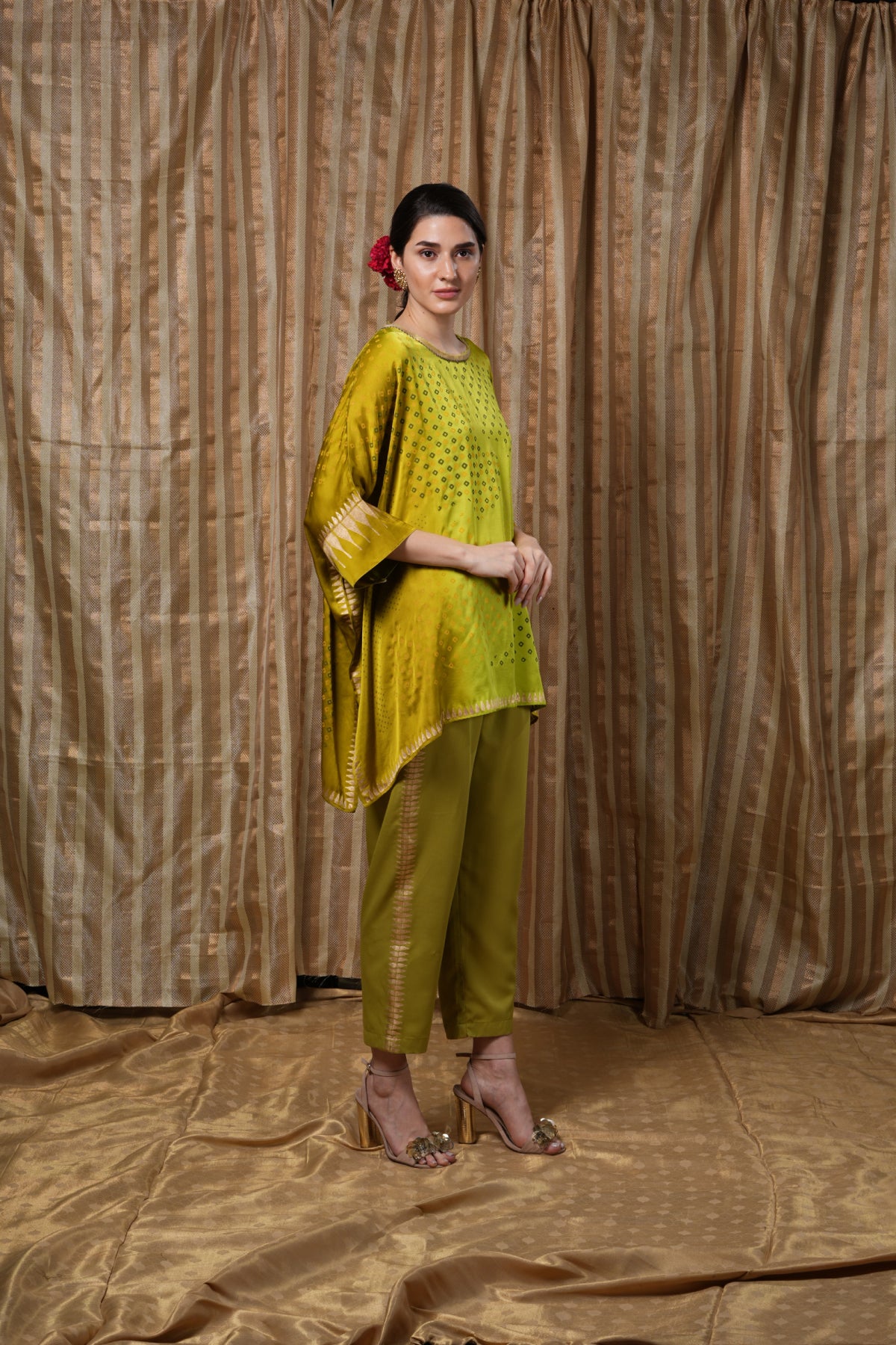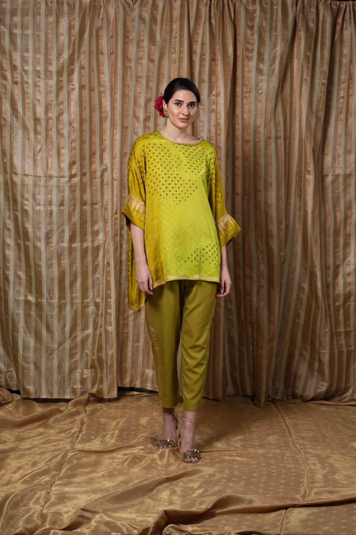 A vibrant lime yellow block-printed kaftan tunic with scattered dot motifs. Its fluid silhouette and high-low hem offer effortless ease and style.