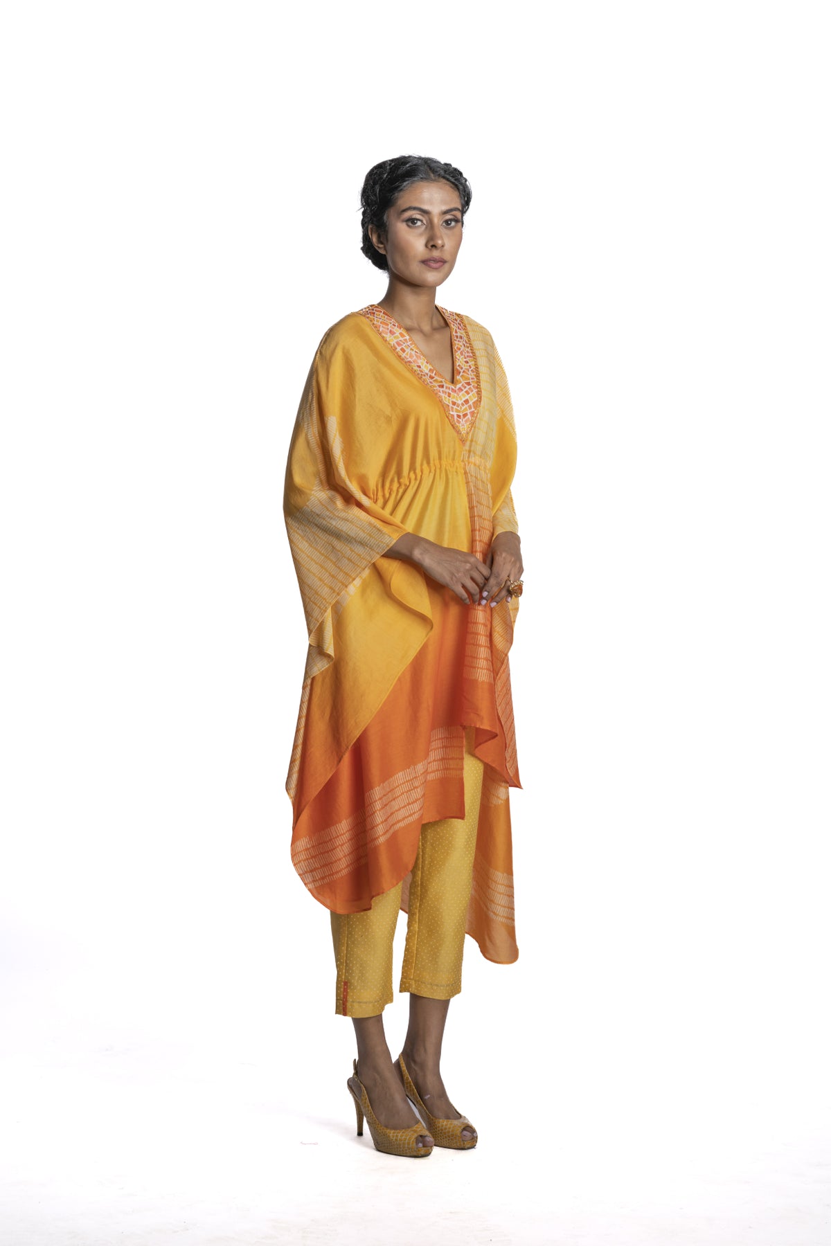 Yellow Orange shaded Chanderi asymmetric kaftan with geometric block print & hand embroidered neckline paired with matching pant.