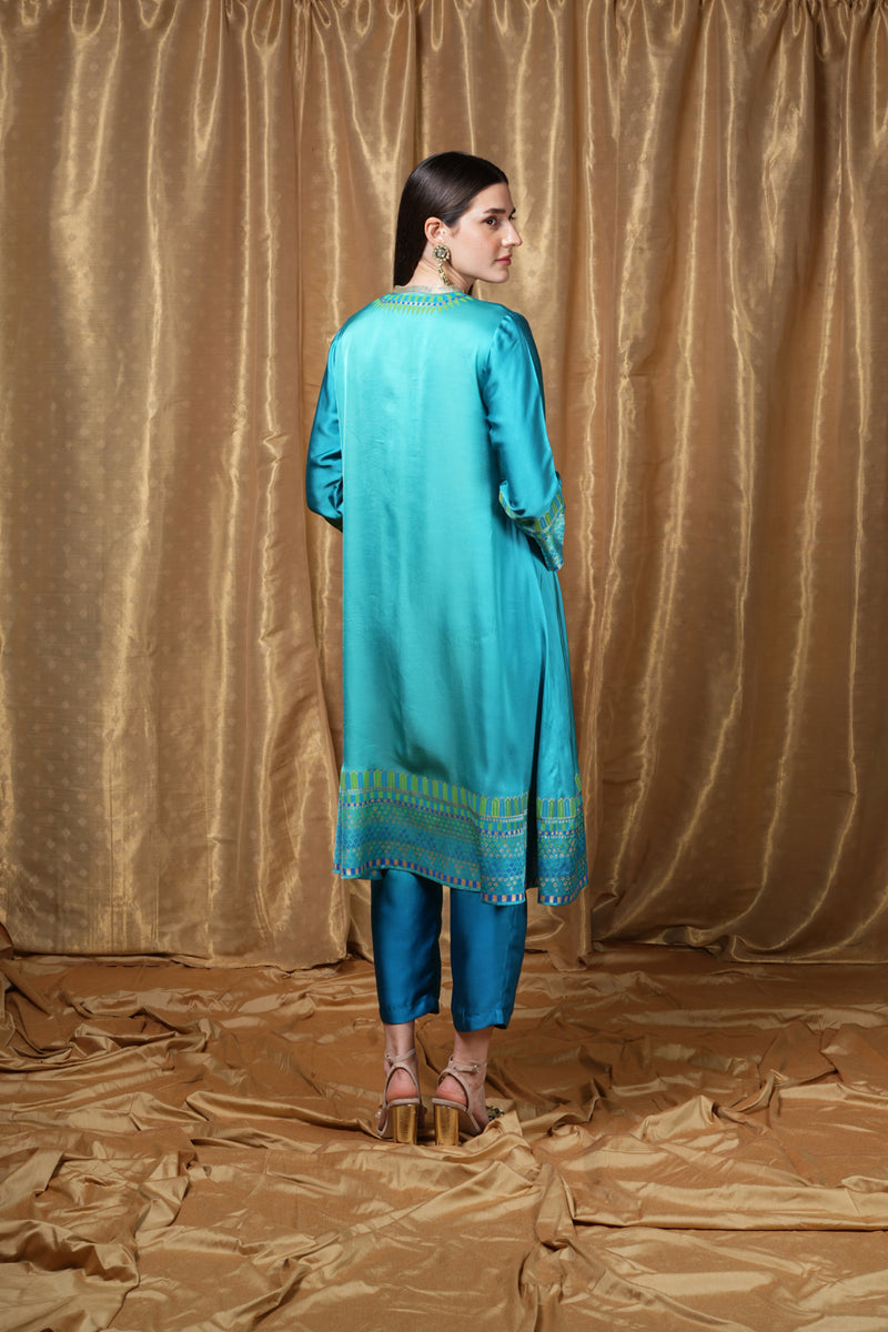 Emerald Turquoise Modal Block Printed & Embroidered Shirt Tunic Set