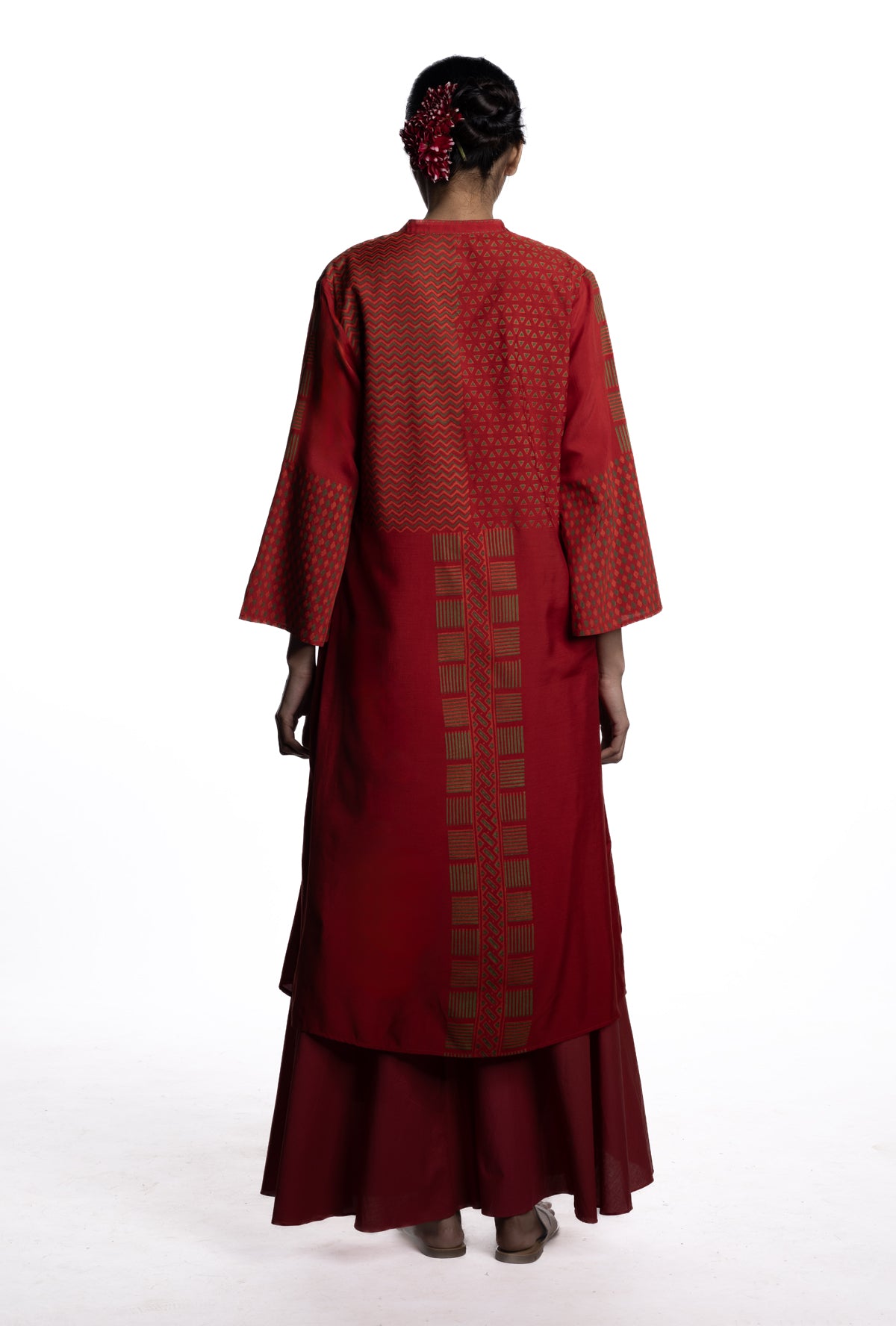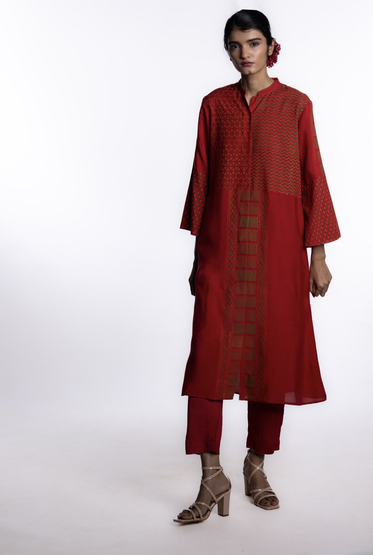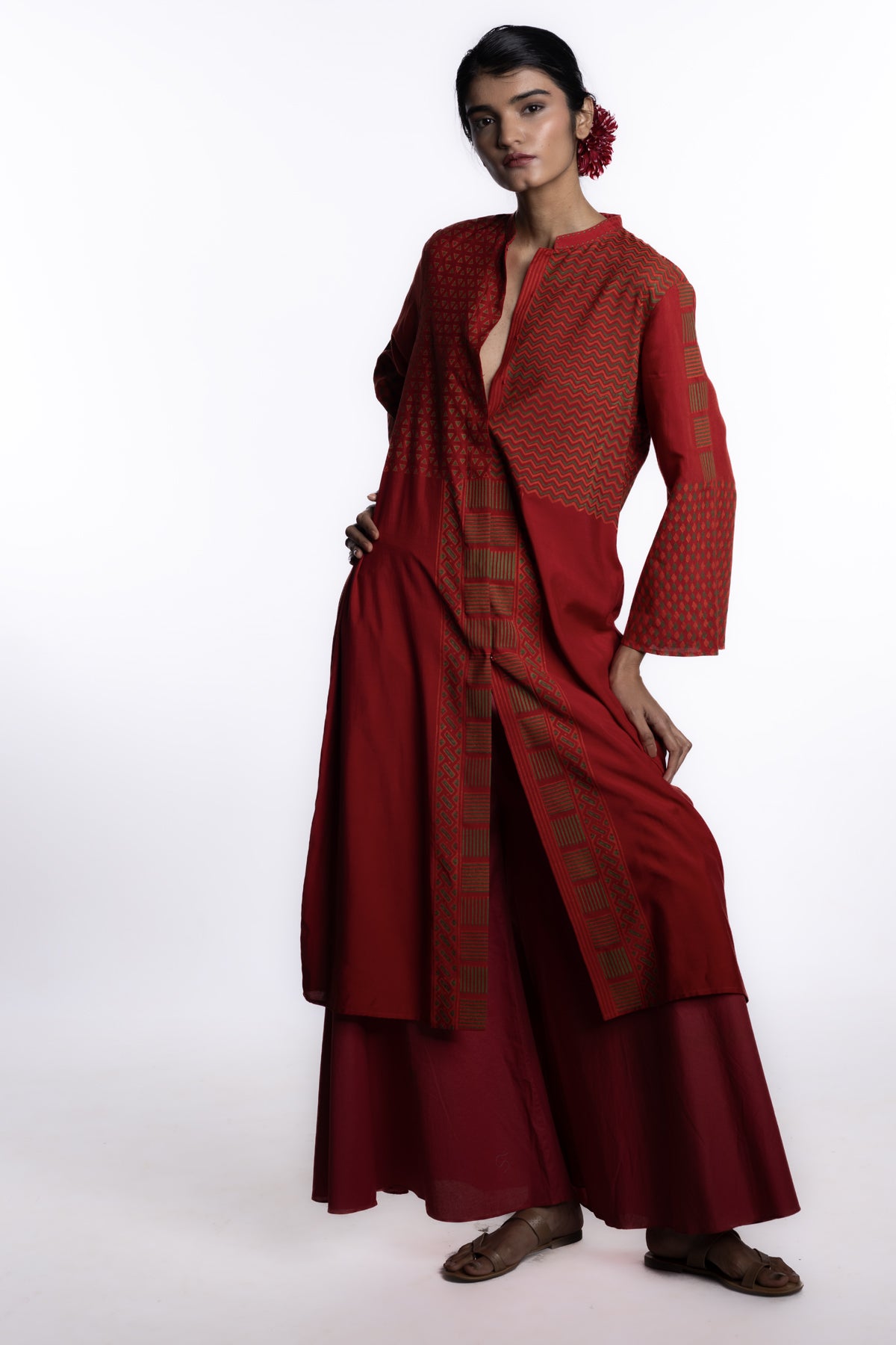 A front-open engineered block printed tunic in red, where geometric motifs are precisely placed to create a striking vertical rhythm.