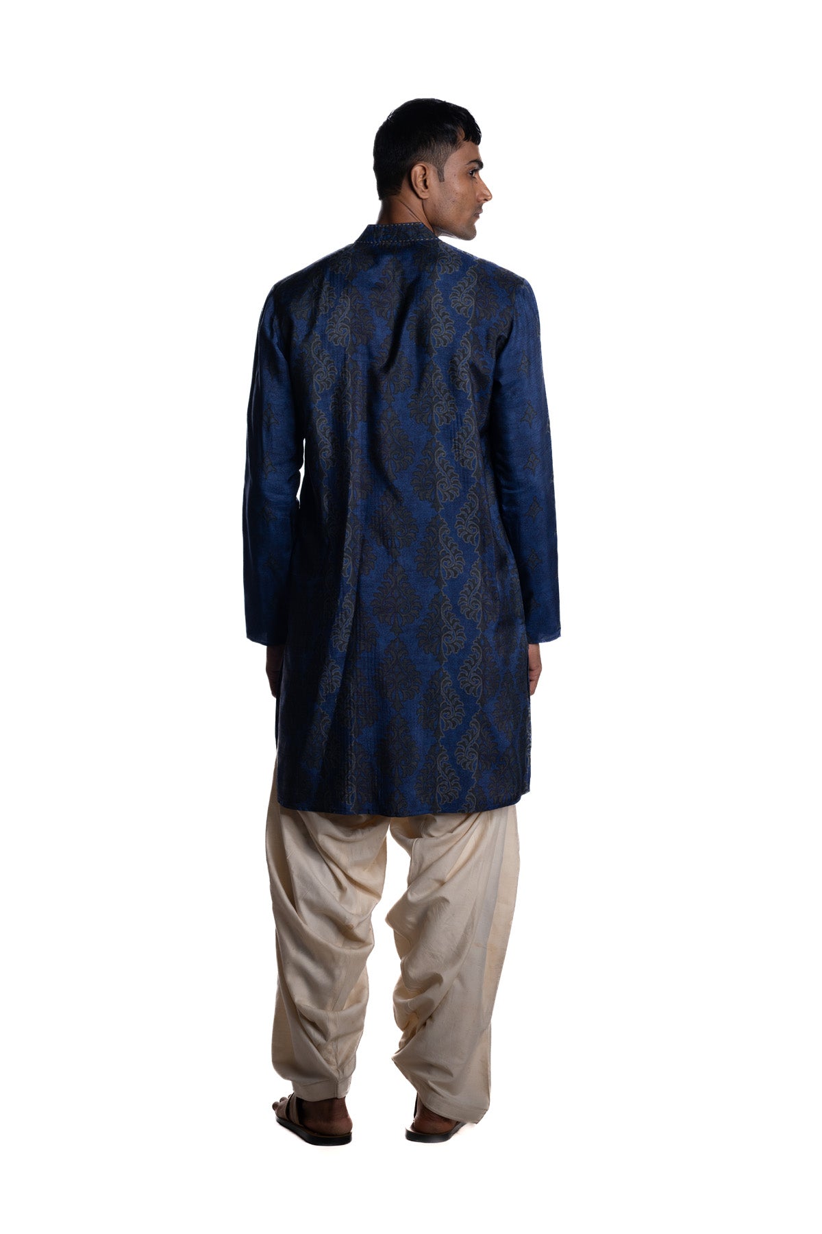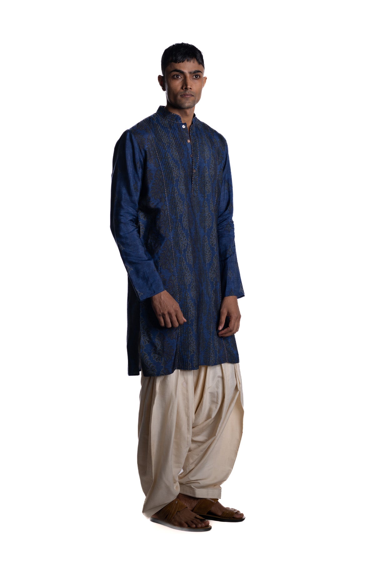 Deep indigo kurta with all-over block print, highlighted by pintuck texture detailing and finished with a clean band collar and minimal placket. Paired with ivory shalwar pants