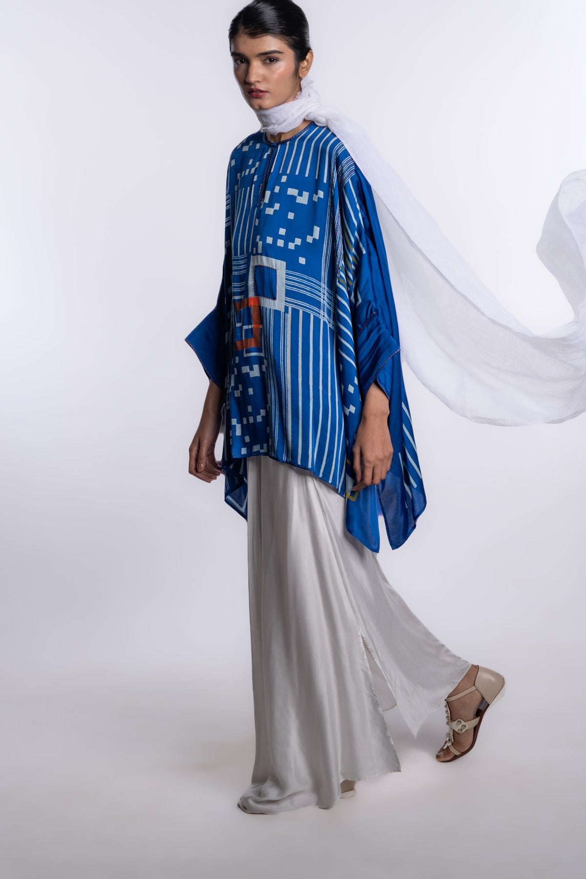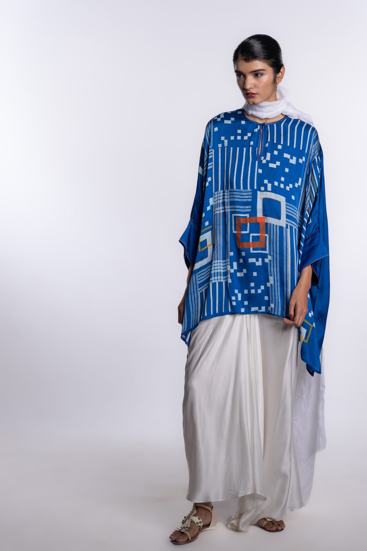 Fluid one-size kaftan top in engineered indigo, featuring bold printed linear and geometric placements that create a striking, architectural surface