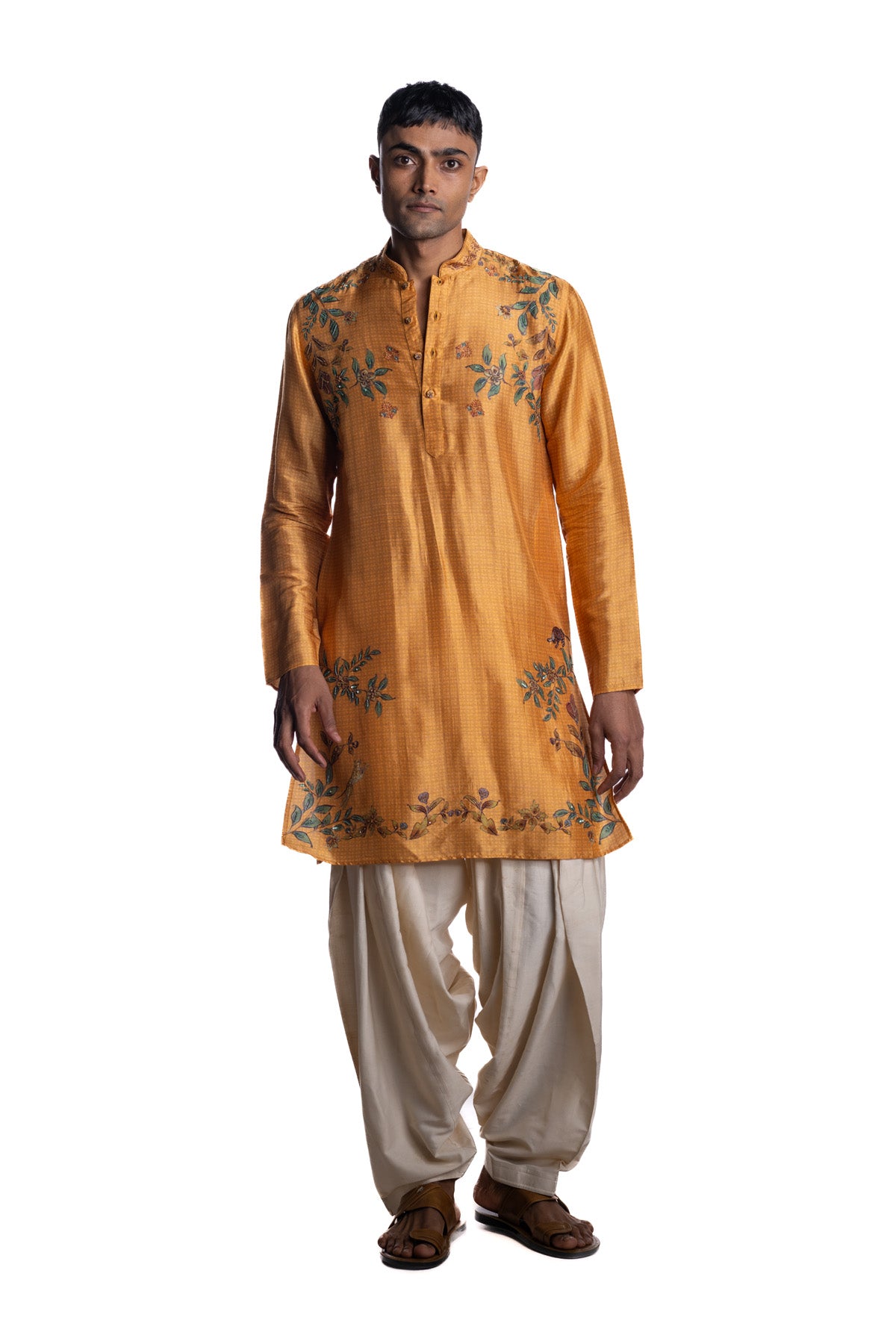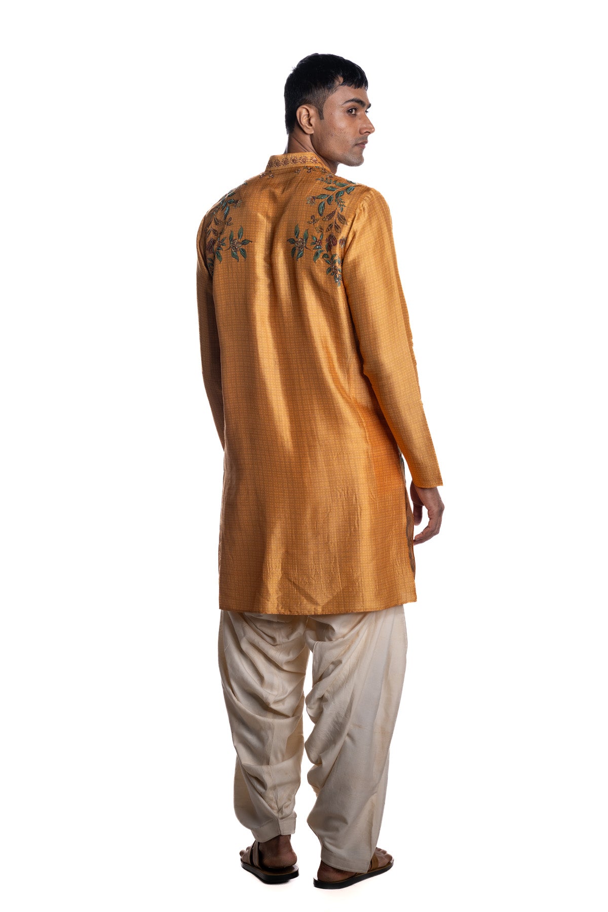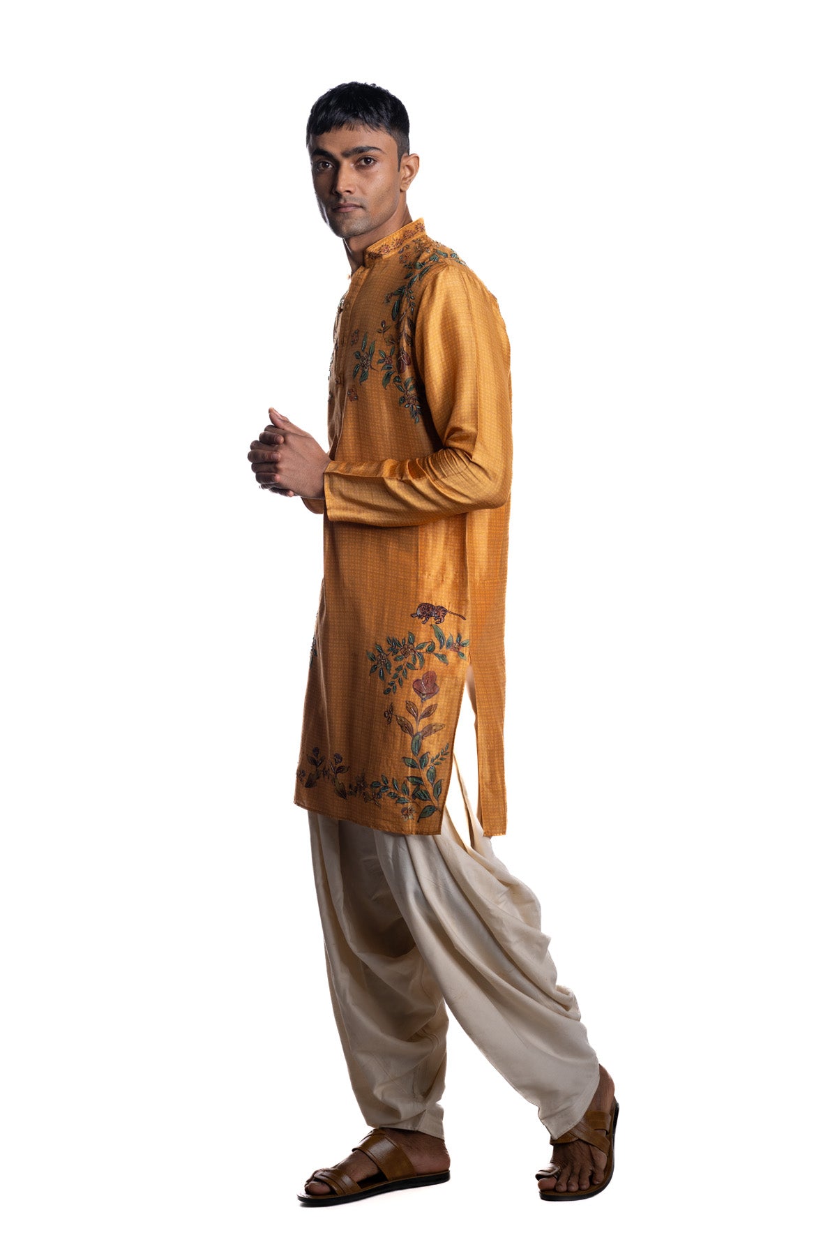 Hand-painted Pichwai–inspired gold kurta with engineered floral motif placement and subtle hand embroidery. Paired with ivory shalwar pants