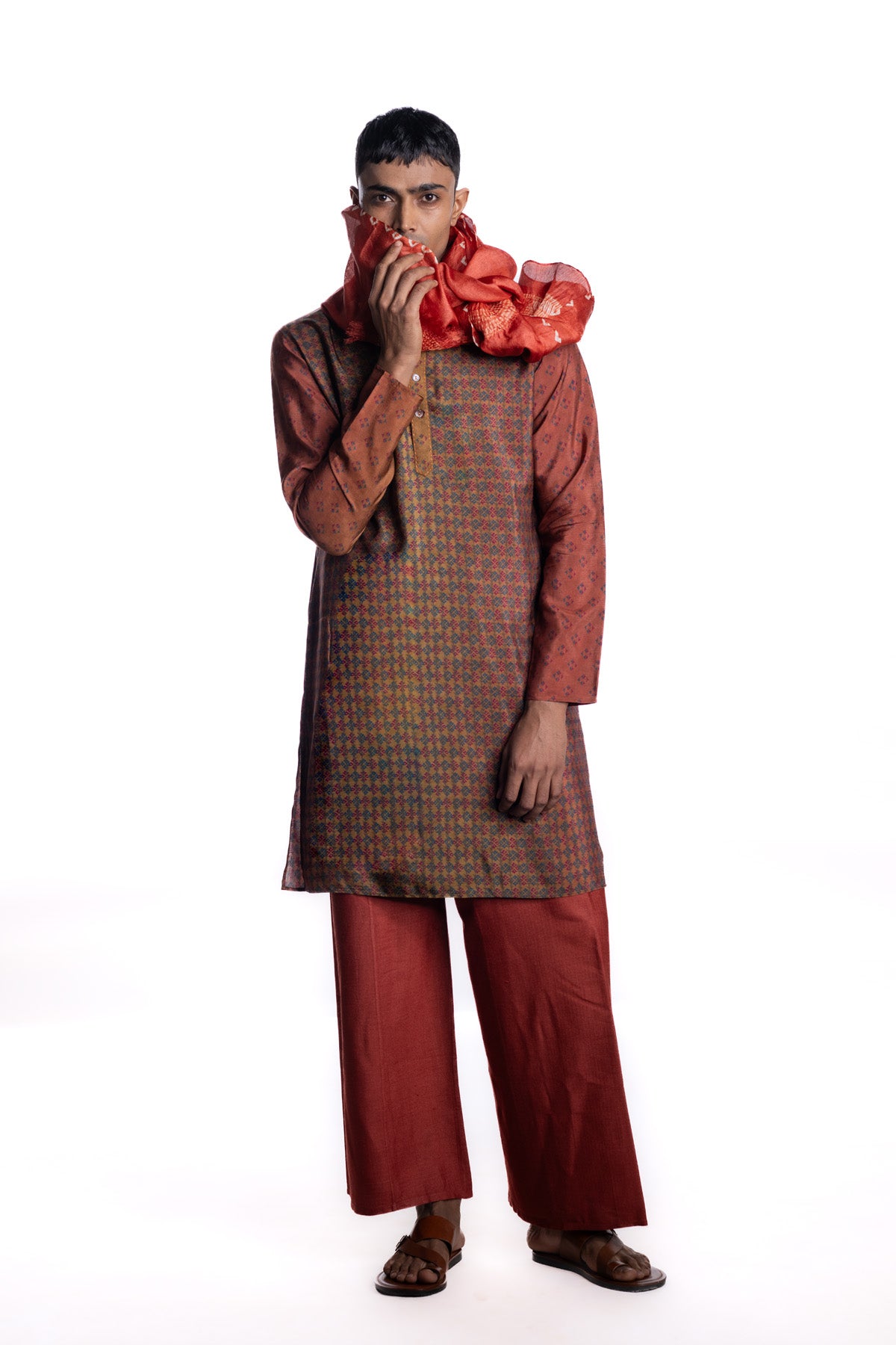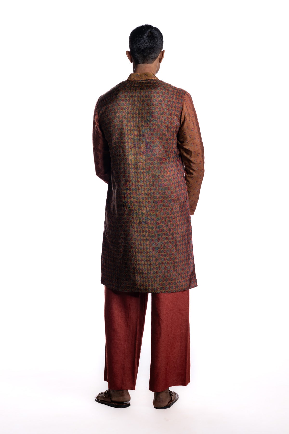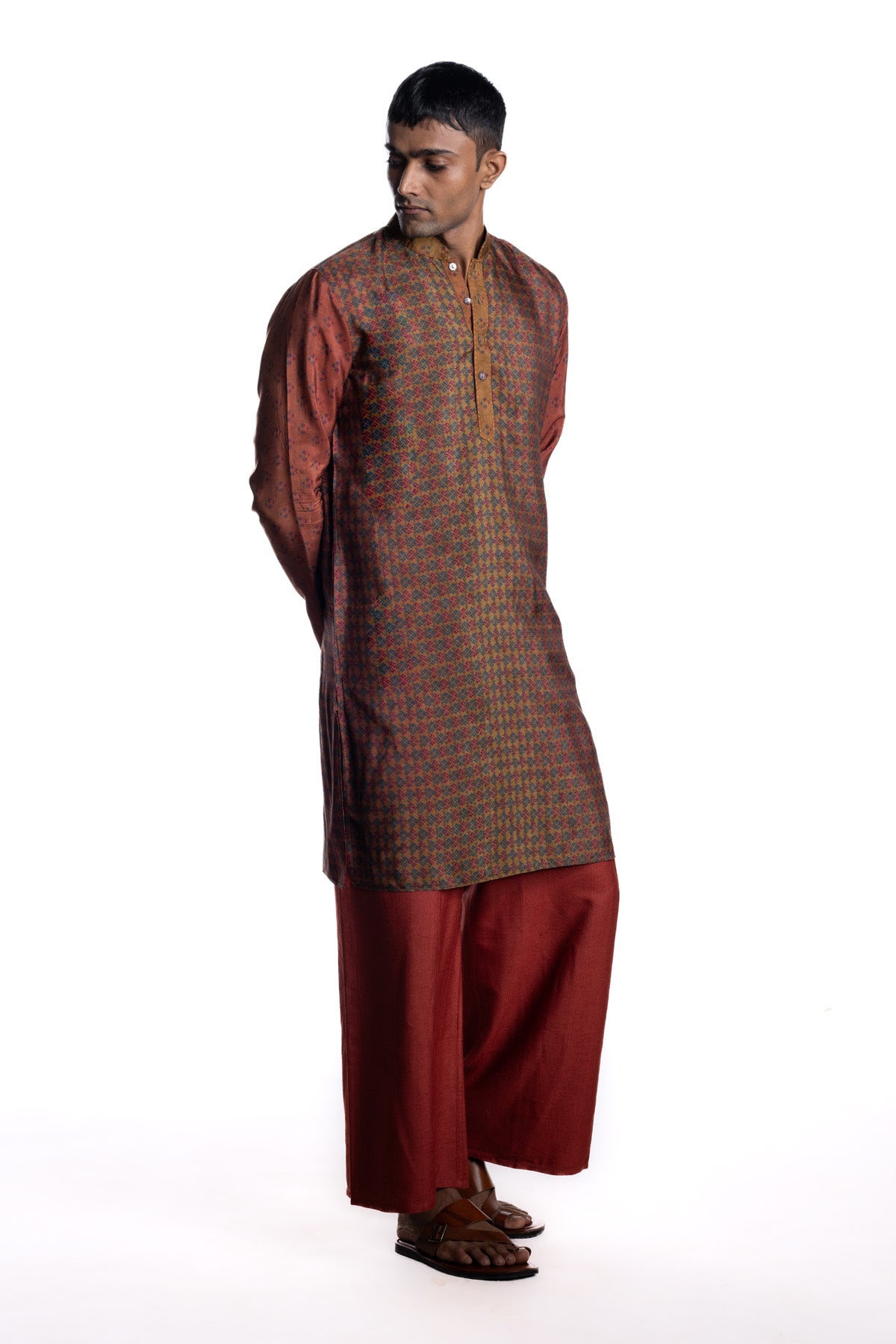 Maroon kurta with all-over engineered geometric block printed accented by a contrasting textured placket and collar detailing.Paired with white narrow pants .