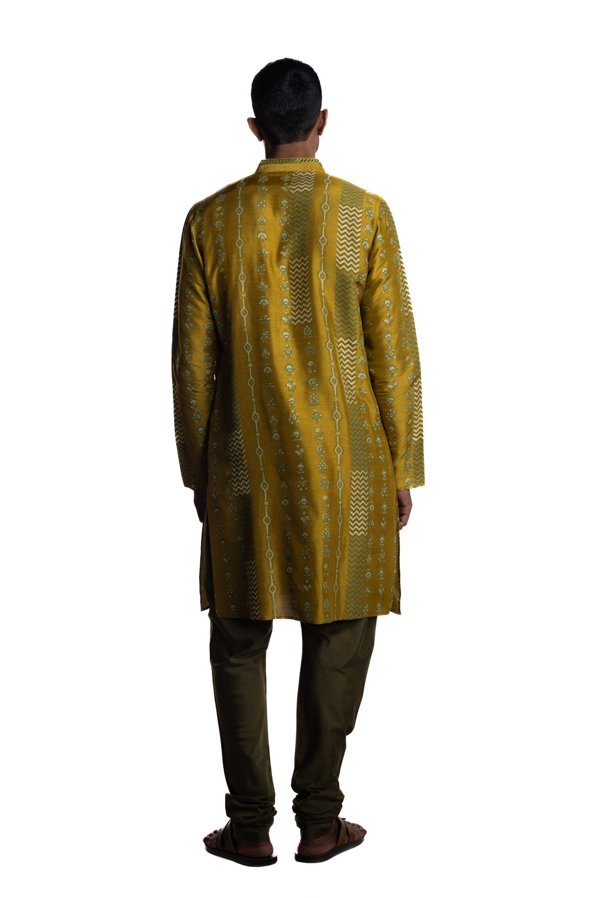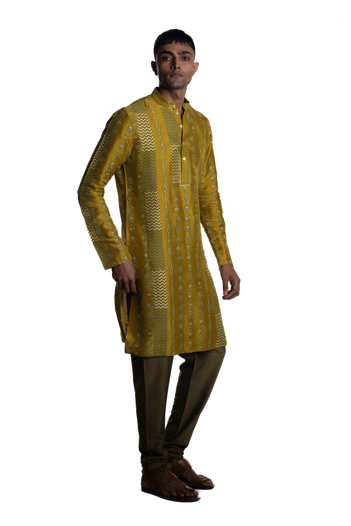 Mustard kurta with all-over engineered vertical hand block–printed motifs, accented by a clean tonal placket and band collar. Paired with olive straight pants