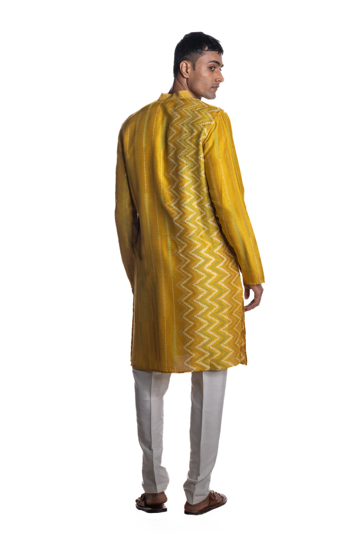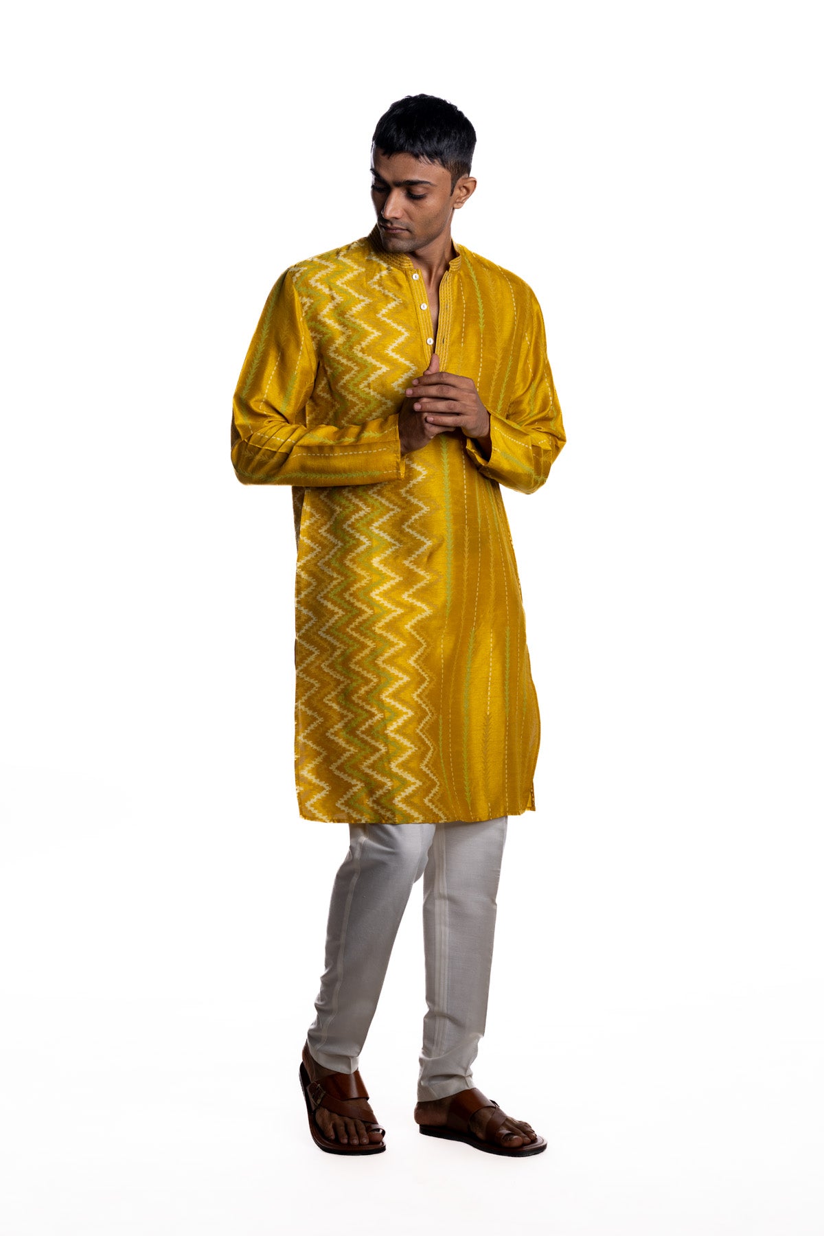 Mustard kurta with engineered half-and-half placement of hand block–printed motifs, finished with a tonal band collar and placket.
