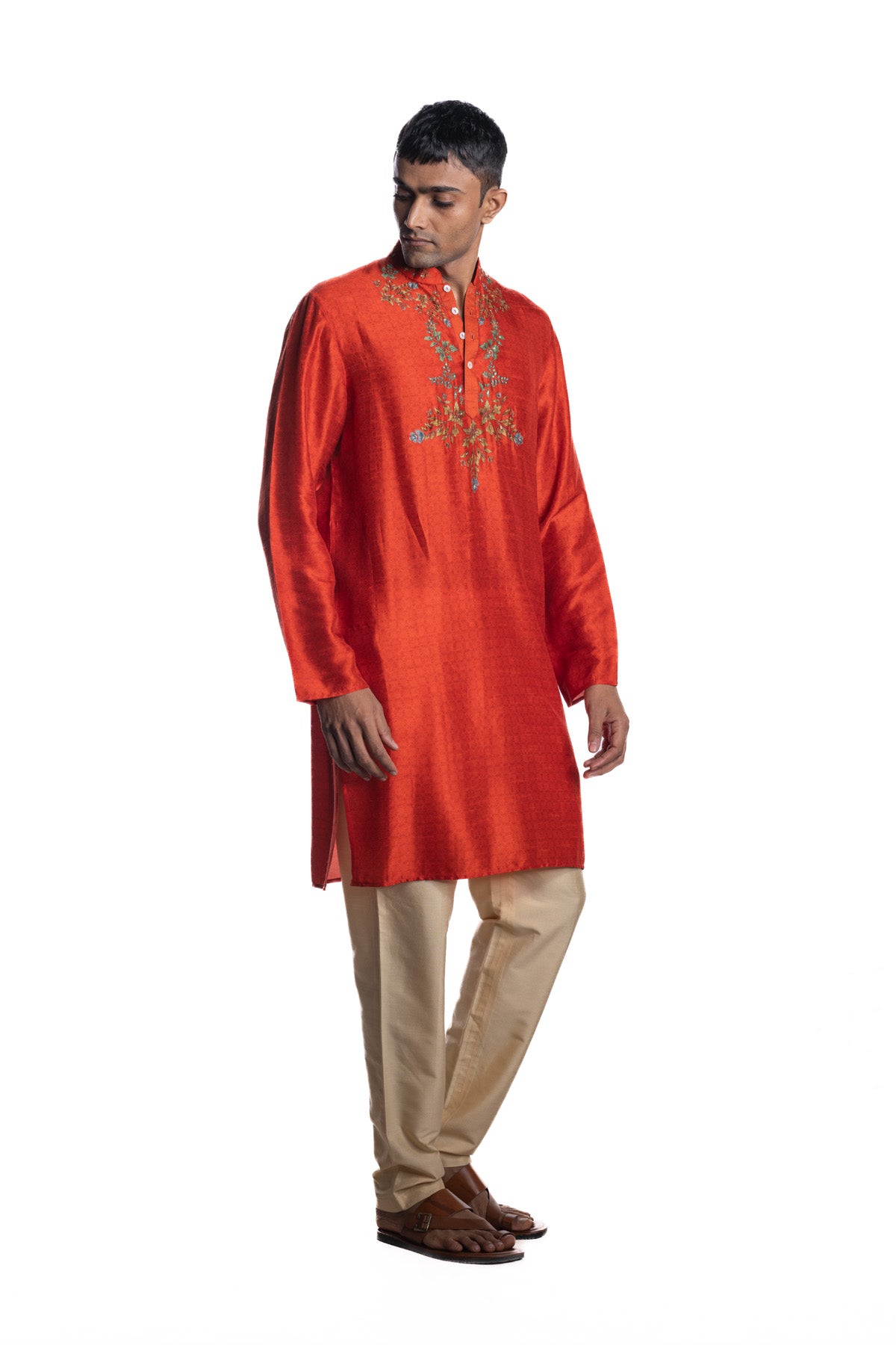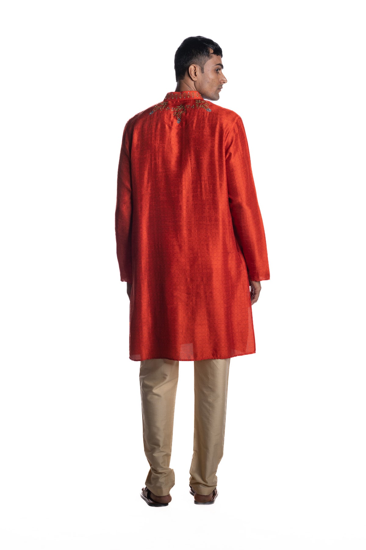 Red kurta from the hand-painted Pichwai–inspired series, featuring engineered motif placement with subtle hand embroidery. Paired with beige narrow pants.