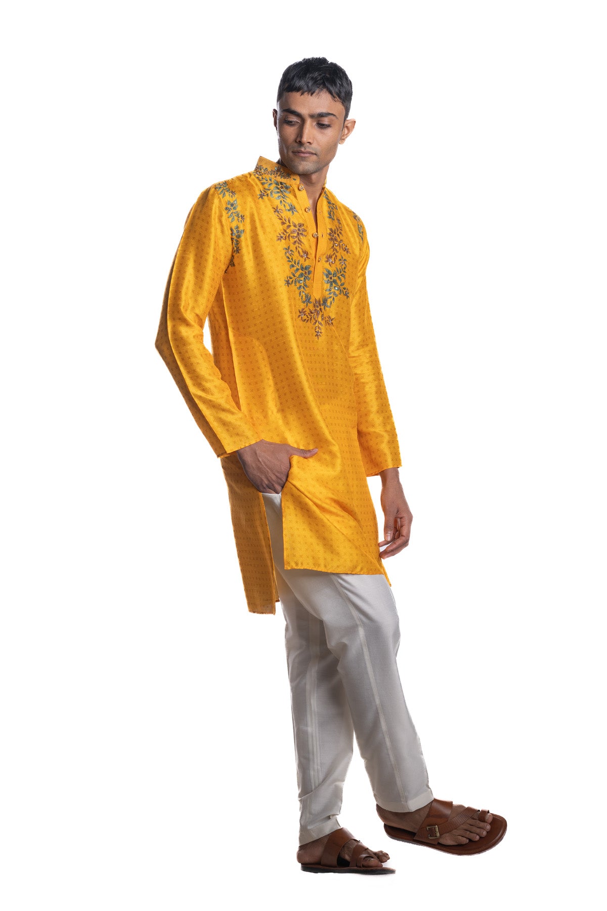 Yellow kurta from the hand-painted Pichwai–inspired series, featuring engineered motif placement with subtle hand embroidery. Paired with ecru narrow pants.